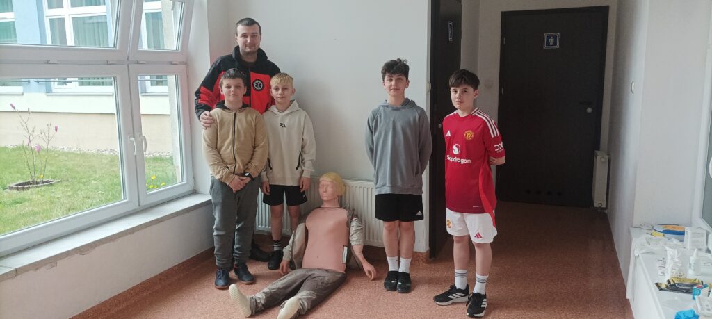 Dodatkowo drużyna prezentowała swoją wiedzę i umiejętności praktyczne z zakresu pierwszej pomocy przedmedycznej. Jakub, Filip i Krzysztof znakomicie poradzili sobie z tym zadaniem udzielając pomocy poszkodowanemu, który doznał licznych obrażeń ciała.