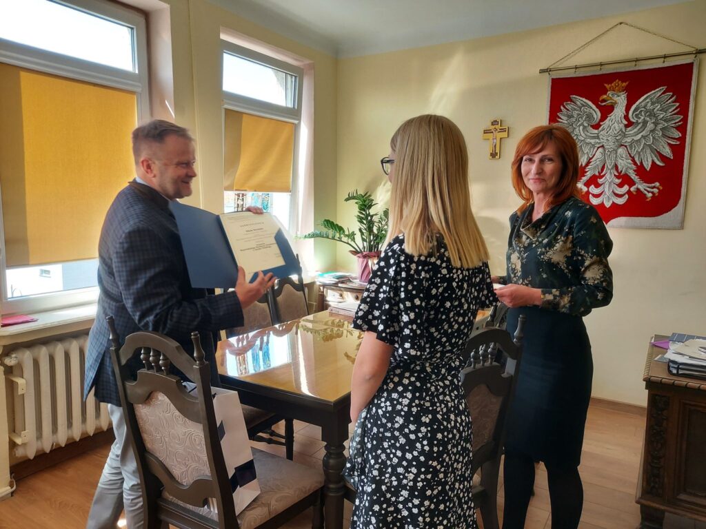 W ubiegłym tygodniu dyrektor naszej szkoły Anna Otwinowska wraz z uczennicą klasy VIIIa Nikolą Kazubską zostały zaproszone do Delegatury Kuratorium Oświaty w Łodzi z siedzibą w Piotrkowie Trybunalskim, gdzie dyrektor Tomasz Trzaskacz wręczył Nikoli zaświadczenie potwierdzające otrzymanie tytułu laureata Wojewódzkiego Konkursu Przedmiotowego z Języka Polskiego oraz nagrodę książkową.