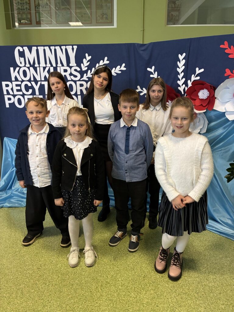 28 października uczennice i uczniowie naszej szkoły wzięli udział w Gminnym Konkursie Recytatorskim im. ks. Mariana Wiewiórowskiego. Konkurs jest organizowany co roku przez Szkołę Podstawową w Gomulinie i biorą w nim pod dział uczniowie szkół gminy Wola Krzysztoporska. Naszą szkołę reprezentowali: Błażej Misztela, Alicja Szymczyk, Michalina Gąsior, Szymon Roksela, Aleksandra Grela, Weronika Jaworska, Maja Wiernicka i Ada Czarczyńska. Dla Michaliny, Alicji, Błażeja i Ady był to pierwszy występ przed jury i tak liczną publicznością. Szymon Roksela zajął I miejsce w kategorii „uczniowie klas I -IV. Aleksandra Grela, Maja Wiernicka i Błażej Misztela otrzymali wyróżnienia. Gratulacje!