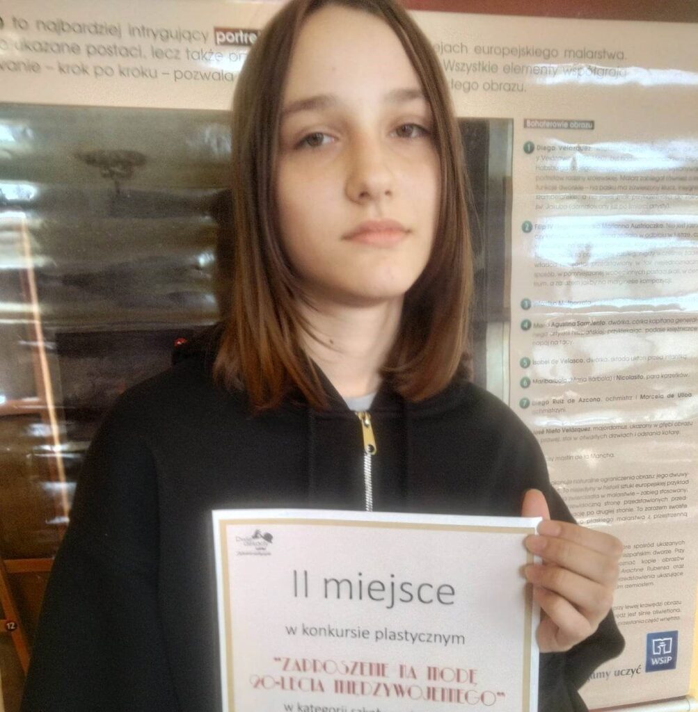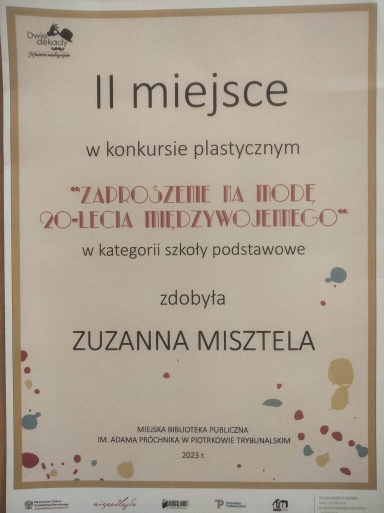 Zuzanna Misztela z kl. 7b zajęła II miejsce w konkursie plastycznym pn. „Zaproszenie na modę 20-lecia międzywojennego”, zorganizowanym w ramach zadania „Dwie dekady – Maestria międzywojnia” organizowanym przez Miejską Bibliotekę Publiczną w Piotrkowie Trybunalskim.