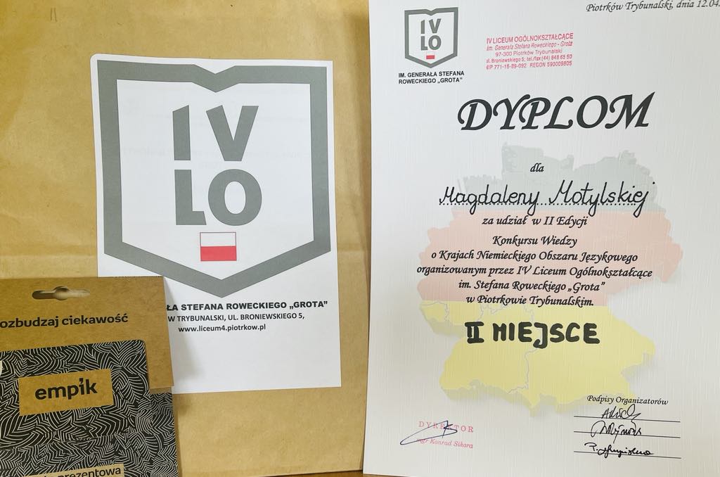 12 kwietnia 2024r. uczennica klasy 8B Magdalena Motylska wzięła udział w II Edycji Konkursu Wiedzy o Krajach Niemieckiego Obszaru Językowego. Organizatorem konkursu było IV LO im. Stefana Roweckiego „Grota” w Piotrkowie Trybunalskim. Magdalena zajęła II miejsce. Gratulujemy!