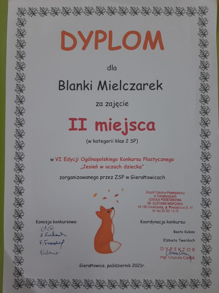 w Ogólnopolskim Konkursie Plastycznym „Jesień w oczach dziecka”.
