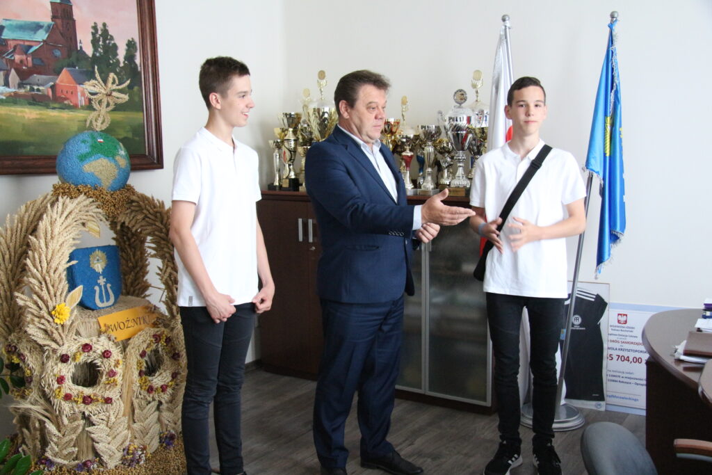 o Społeczeństwie i Samorządzie Terytorialnym, w którym Kacper zajął I miejsce. ,,Nowemu Wójtowi ‘’ towarzyszył brat Marcel, który w konkursie zajął II miejsce. Przez jeden dzień młodzi samorządowcy mogli zobaczyć, jak wygląda codzienna praca gospodarza gminy. Chłopcy uczestniczyli w przyjmowaniu interesantów, załatwianiu bieżących spraw związanych