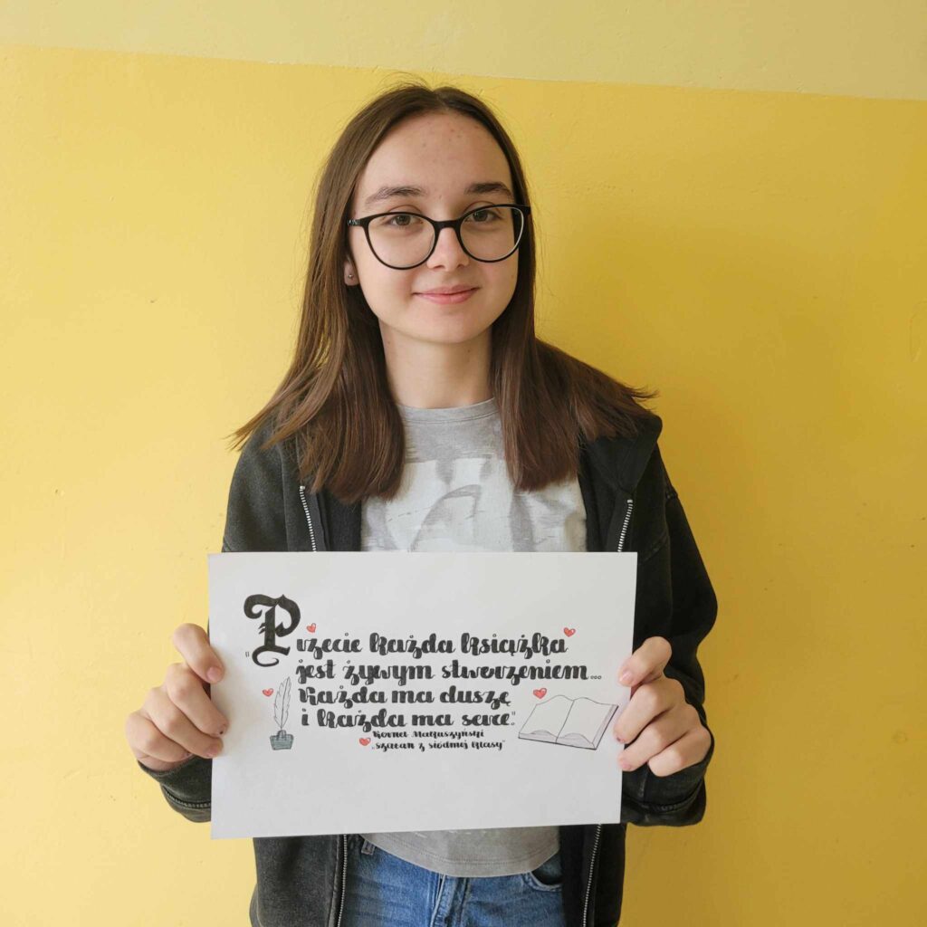 W tym roku po raz pierwszy nasza szkoła wzięła udział w Ogólnopolskim Konkursie Kaligraficznym im. Janusza Korzeniowskiego „Piórem i Pazurem” w Warszawie. Na przestrzeni ostatnich miesięcy odbywały się kolejne etapy konkursu. Do pierwszego etapu zgłosiło się ponad 4363 uczestników, którzy w swoich pracach interpretowali cytaty Kornela Makuszyńskiego. Jak co roku, zadanie konkursowe polegało na pięknym przepisaniu zadanego tekstu oraz ozdobieniu go iluminacjami, inicjałem lub bordiurą. Jedna z naszych uczennic – Oliwia Renasik, zakwalifikowała się do III etapu – finału ogólnopolskiego, do którego przygotowała kolejną pięknie wykaligrafowaną pracę.
