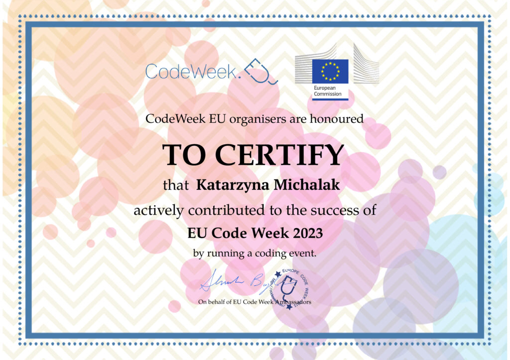 Po raz kolejny nasza szkoła wzięła udział w Europejskim Tygodniu Kodowania i została oficjalnie wpisana na mapę EU Code Week 2023. Na zajęciach z informatyki uczniowie korzystali z gier online uczących logicznego myślenia oraz rozwijających kreatywność, myślenie komputacyjne, a także wyobraźnię przestrzenną. Korzystając z zasobów strony koduj.gov.pl tworzyli rozwiązania problemów związanych z kodowaniem. Również wprowadzone zostały elementy sztucznej inteligencji poprzez pracę w różnych aplikacjach.