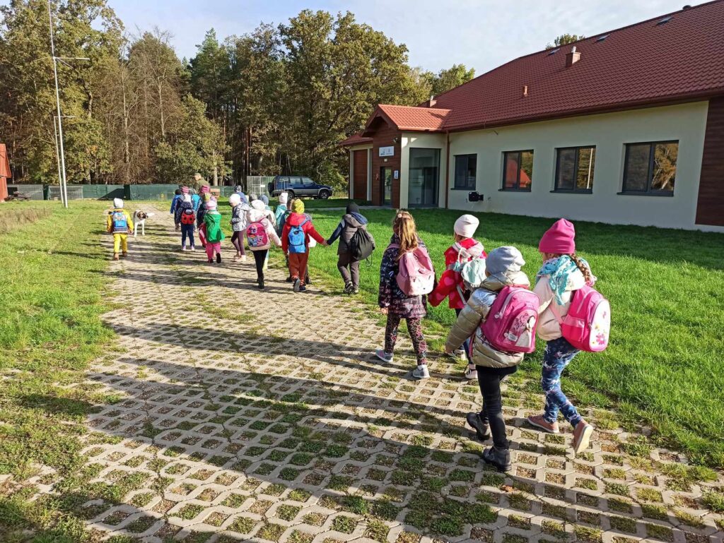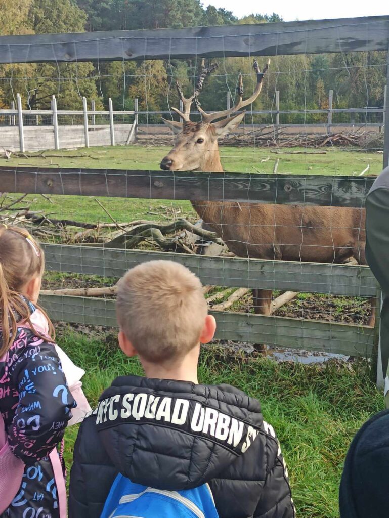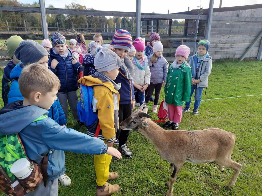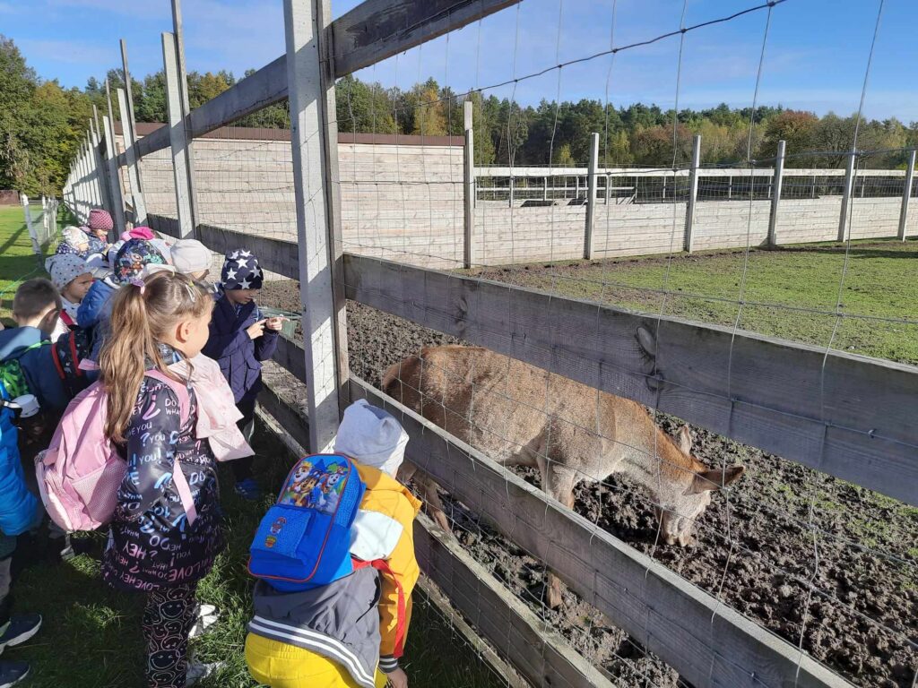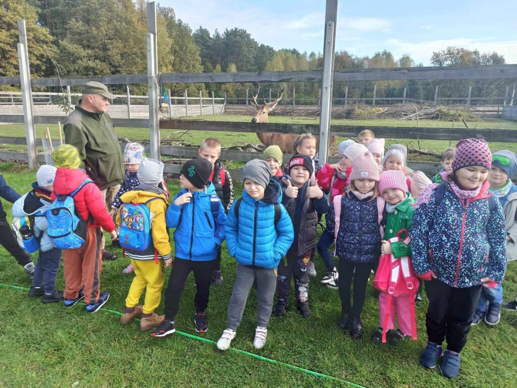 24 października 2023 r. dzieci oddziałów przedszkolnych 0a i 0b z wychowawcami uczestniczyły w wycieczce do Leśnej Osady Edukacyjnej w Kole. Leśna Osada Edukacyjna posiada status Ośrodka Rehabilitacji Zwierząt, który prowadzi leśniczy Paweł Kowalski. Głównym celem wycieczki było poznanie lasu i jego mieszkańców. Pan leśniczy w ciekawy sposób opowiadał o zwierzętach tam mieszkających. Poznaliśmy popularne gatunki zwierząt leśnych oraz min. tj. sójki, gawrony, bociany, myszołowy oraz lisy, dziki, jelenie łosie oraz ich zwyczaje. Ostatnim punktem wycieczki było spotkanie przy ognisku. W wolnym czasie dzieci swobodnie bawiły się na świeżym powietrzu oraz mogły z bliska obserwować zabawy kóz. Dzieci z wycieczki wróciły bardzo zadowolone. Pogłębiły i poszerzyły swoją wiedzę przyrodniczą. Poznały w jaki sposób należy zachowywać się w kontakcie z dzikimi zwierzętami oraz jak reagować w przypadku zaatakowania przez dzika. Żywo i emocjonalnie reagowały na nowe wiadomości, ponieważ realnego kontaktu z przyrodą nie zastąpi się najlepszymi nawet fotografiami czy filmami.
