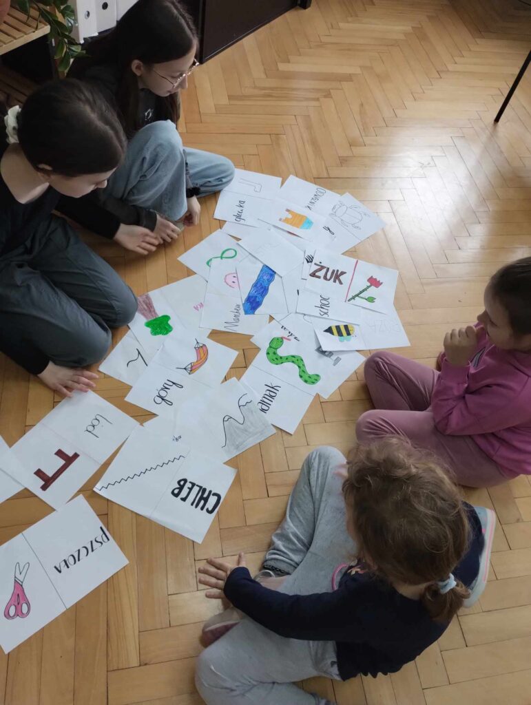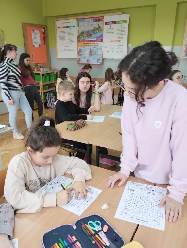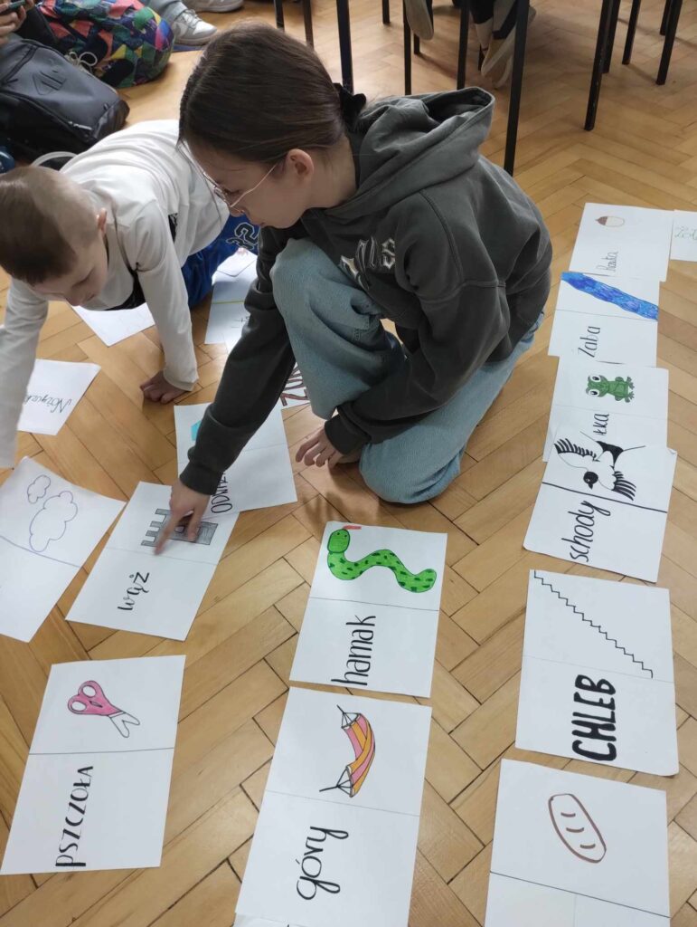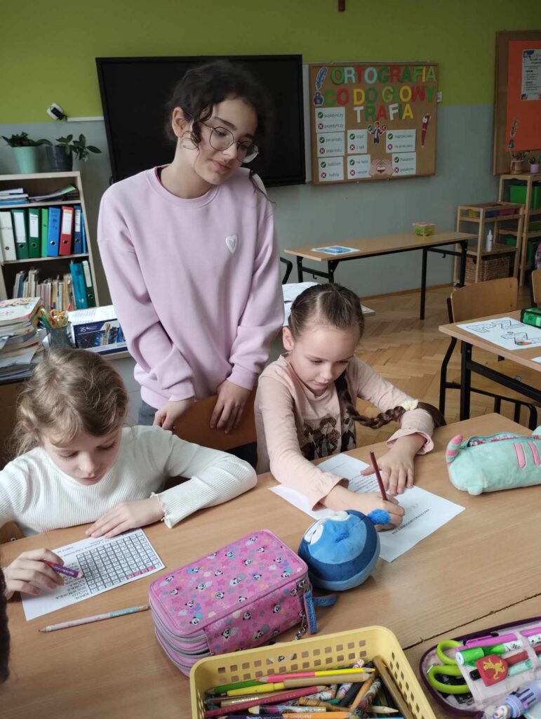 ·        uczniowie klasy 6b ,pod hasłem ,,Ortografia, co do głowy trafia”, utrwalali z młodszymi koleżankami i kolegami ciekawostki ortograficzne, w formie: rebusów, krzyżówek, kolorowanek, układania domina, itp.