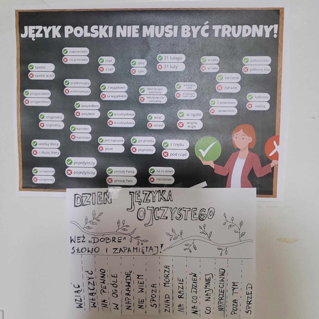 W dniach 21-29 lutego 2024r. promowaliśmy nasz język narodowy oraz uświadamialiśmy społeczność szkolną, jak ważne jest prawidłowe posługiwanie się językiem ojczystym w życiu codziennym, czy też w sieci. W tym celu przeprowadzone zostały różne przedsięwzięcia takie jak: