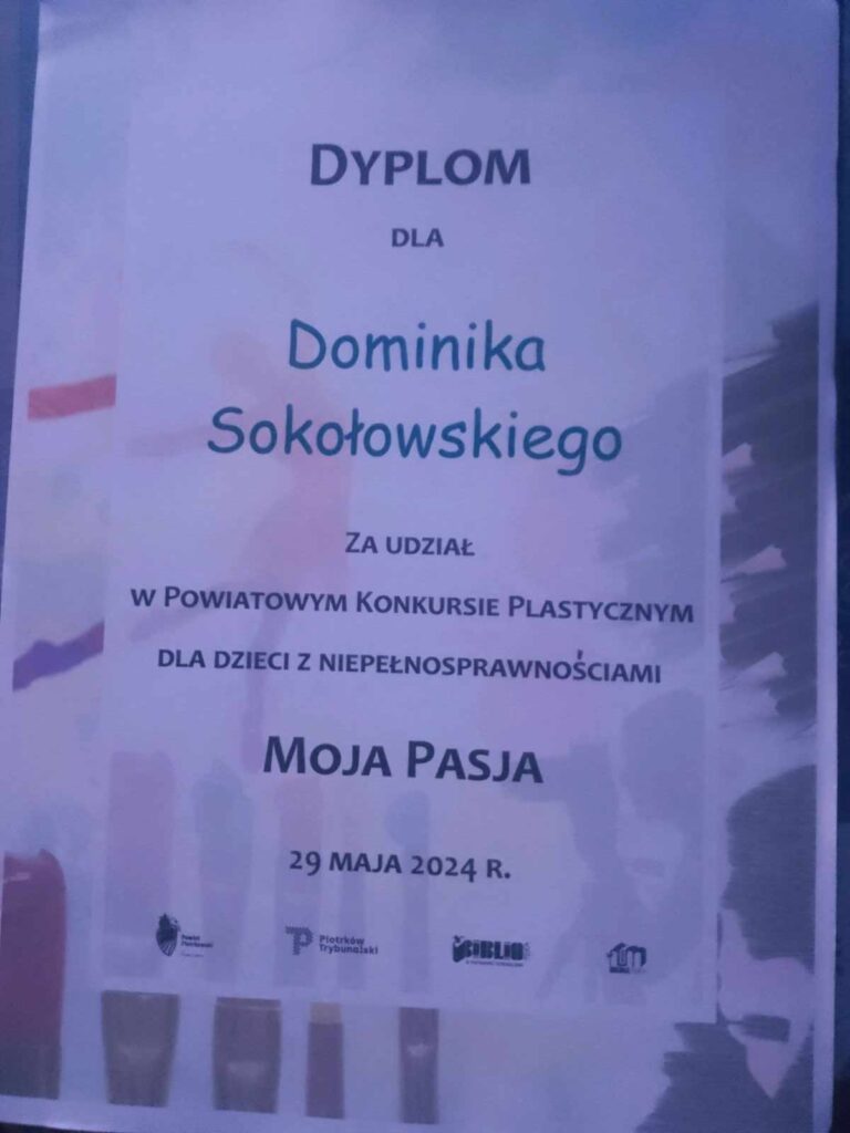 Dominik Sokołowski na lekcjach plastyki z p. Katarzyna Michalak wykonał bardzo ciekawą pracę na konkurs dla uczniów z niepełnosprawnościami „MOJA PASJA”, który od lat organizuje MBP w Piotrkowie Trybunalskim. Uczeń po raz kolejny zaangażował się w pracę twórczą, w poprzedniej edycji konkursu otrzymał wyróżnienie specjalne za wytworzenie przestrzennych robotów.