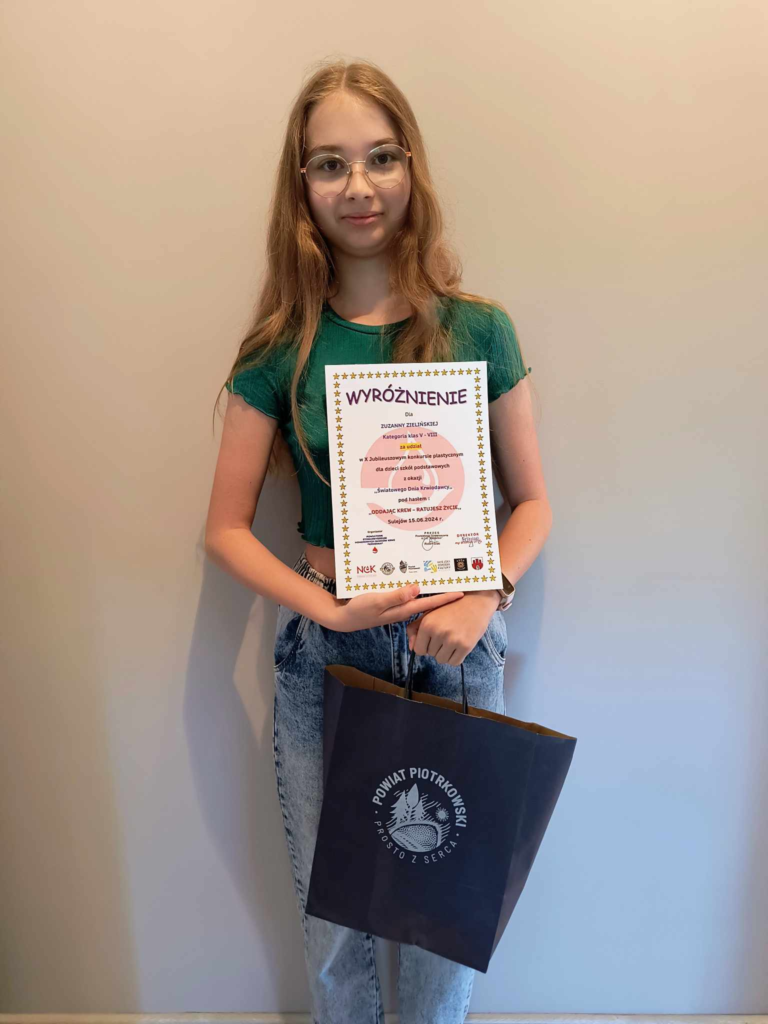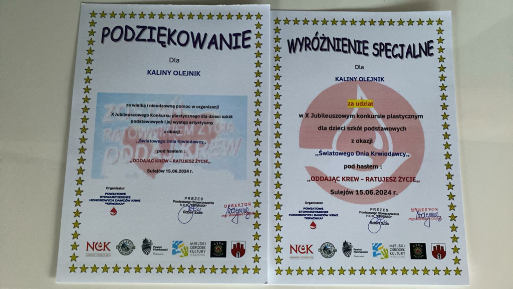 Uczniowie naszej szkoły wzięli udział w konkursie plastycznym „Oddając krew – ratujesz życie”, zorganizowanym przez Stowarzyszenie HDK „Krwinka”. Podczas jubileuszowej gali podziękowanie za występ wokalny otrzymała Kalina Olejnik. Natomiast aż pięć osób (spośród stu, które nadesłały prace na konkurs) uzyskało wyróżnienia. Są to: