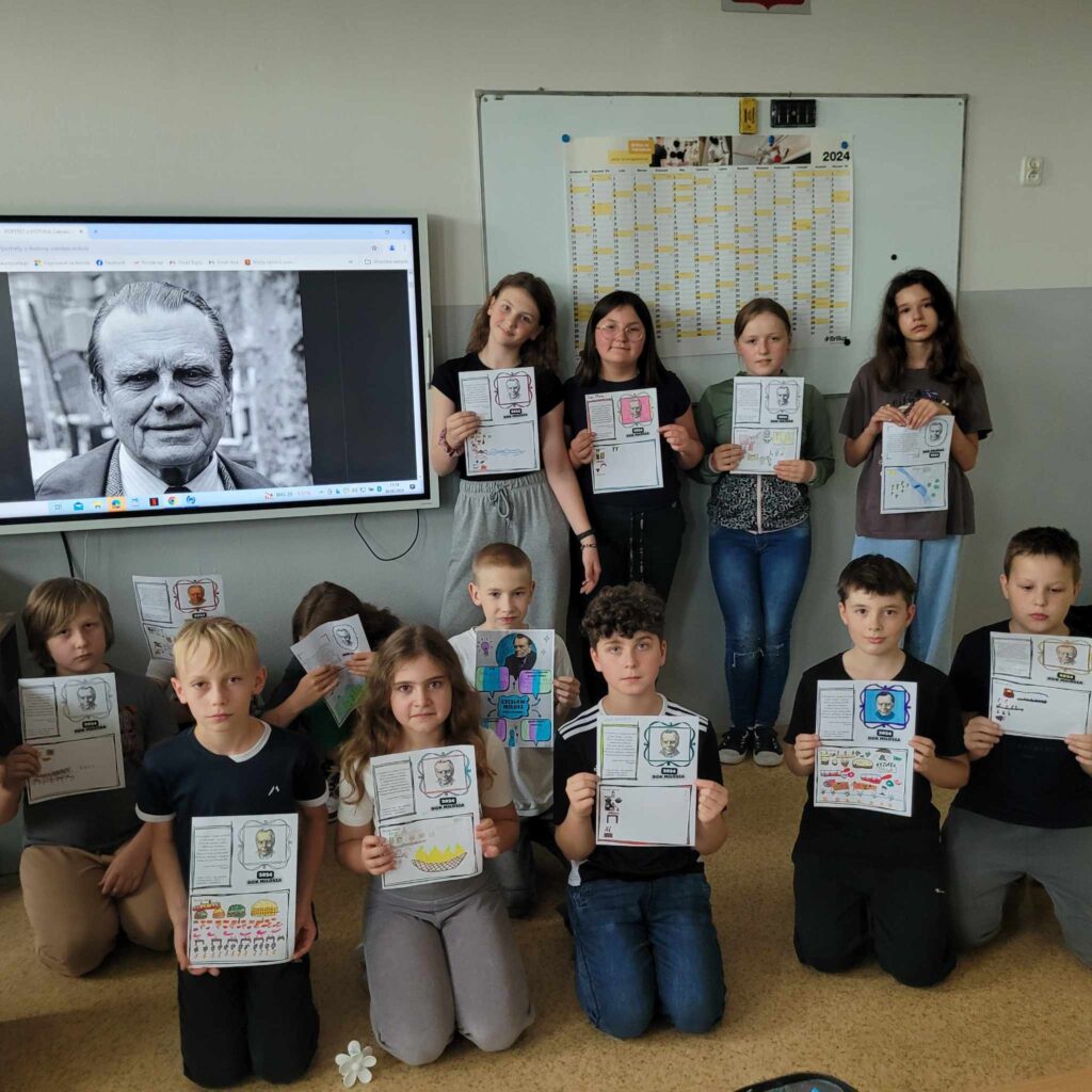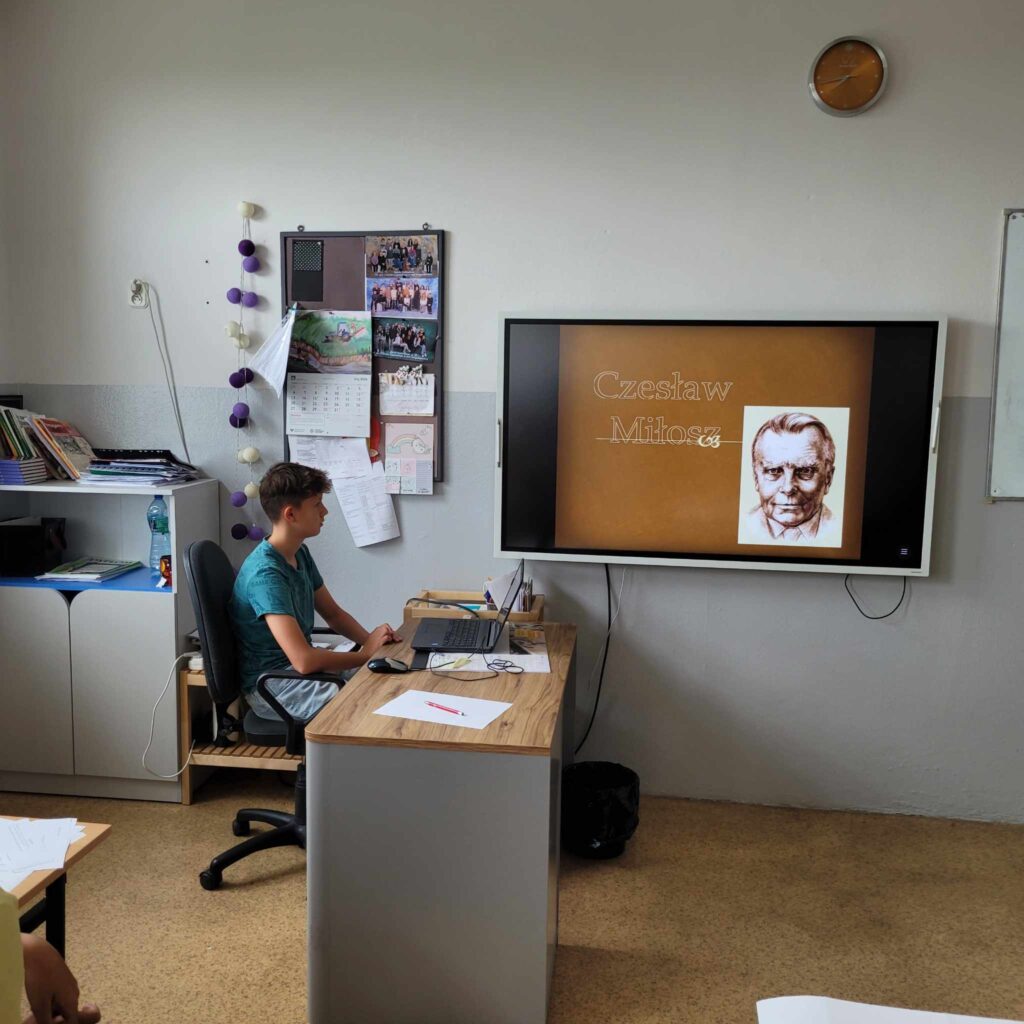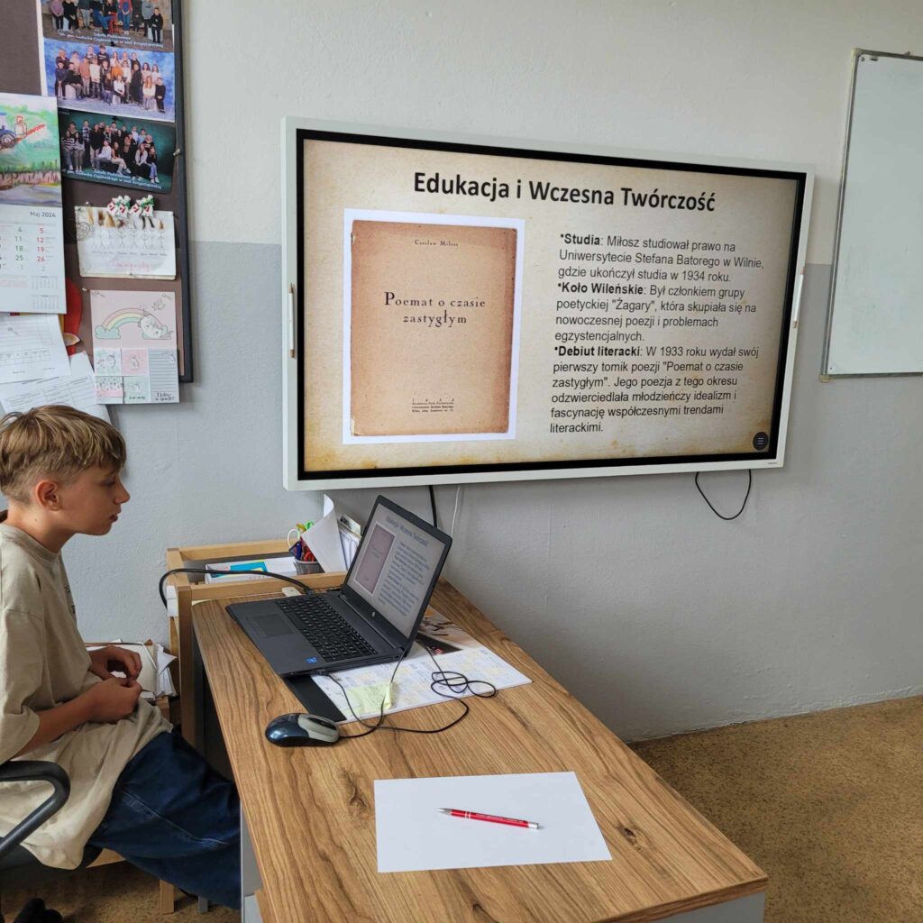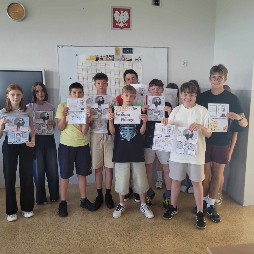 W ramach OGÓLNOPOLSKIEGO PROJEKTU EDUKACYJNEGO „Miłosz w szkole” uczniowie klasy 7b Szkoły Podstawowej w Woli Krzysztoporskiej wykonali prezentacje multimedialne poświęcone nobliście. Następnie uczestniczyli w „Lekcji z Miłoszem” i uzupełniali notatkę graficzną, która pozwoliła zapamiętać fakty z życia noblisty.