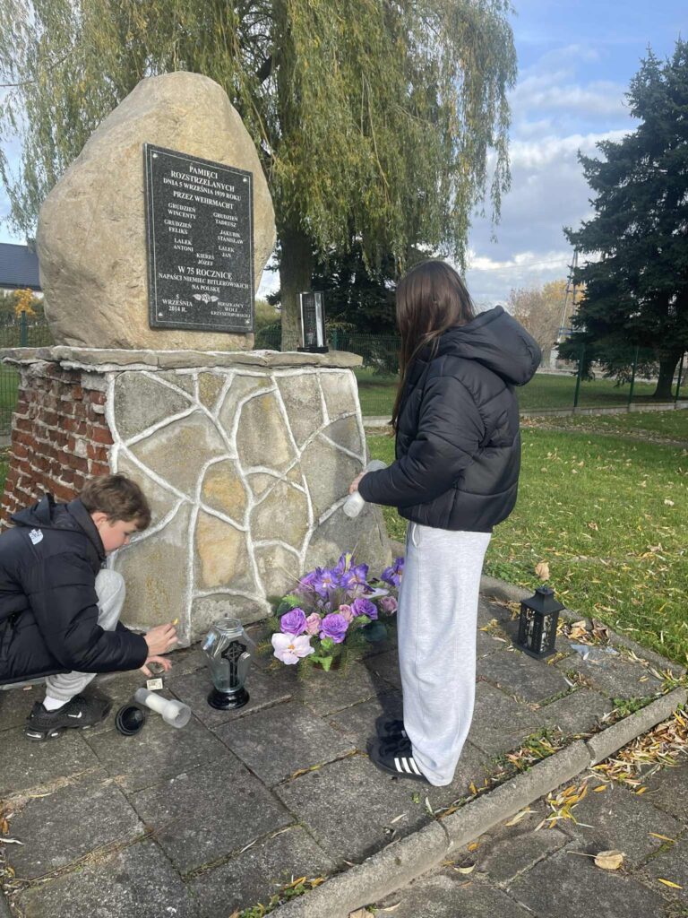 W dniu 29 X 2025 r. uczniowie naszej szkoły wraz z opiekunami p. Agnieszką Kałużną – Michalak oraz p. Katarzyną Stawiak udali się pod obelisk znajdujący się w parku przy Kościele parafialnym w Woli Krzysztoporskiej. Pomnik ten upamiętnia tragiczne wydarzenia z 5 września 1939 roku, kiedy to żołnierze Wehrmachtu rozstrzelali mieszkańców naszej gminy – niewinnych ludzi, którzy stali się ofiarami pierwszych dni II wojny światowej.