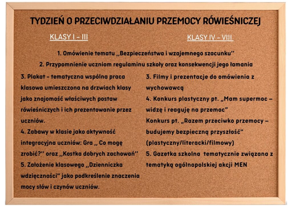 przygotowaliśmy szereg działań skierowanych do klas I – VIII mających na celu aktywne uczestnictwo uczniów w akcji, a tym samym zwiększenie u odbiorców empatii, wrażliwości na drugiego człowieka, wyrozumiałości, a także poznania rodzajów przemocy, objawów, przyczyn, a przede wszystkim sposobów reagowania na oznaki przemocy. Poniżej znajdują się zaplanowane działania opisane w skrócie do realizacji w zbliżającym się tygodniu.