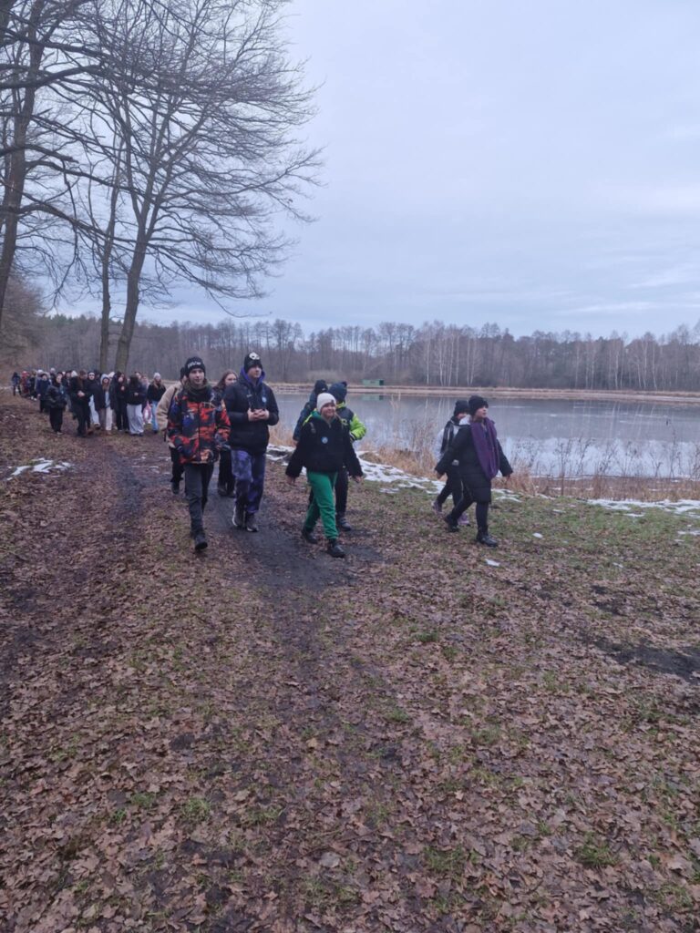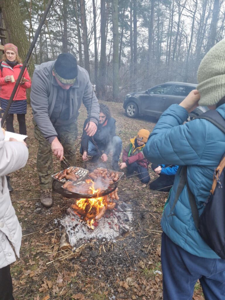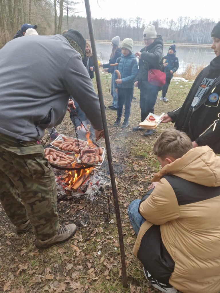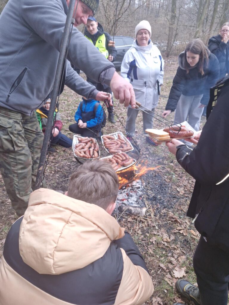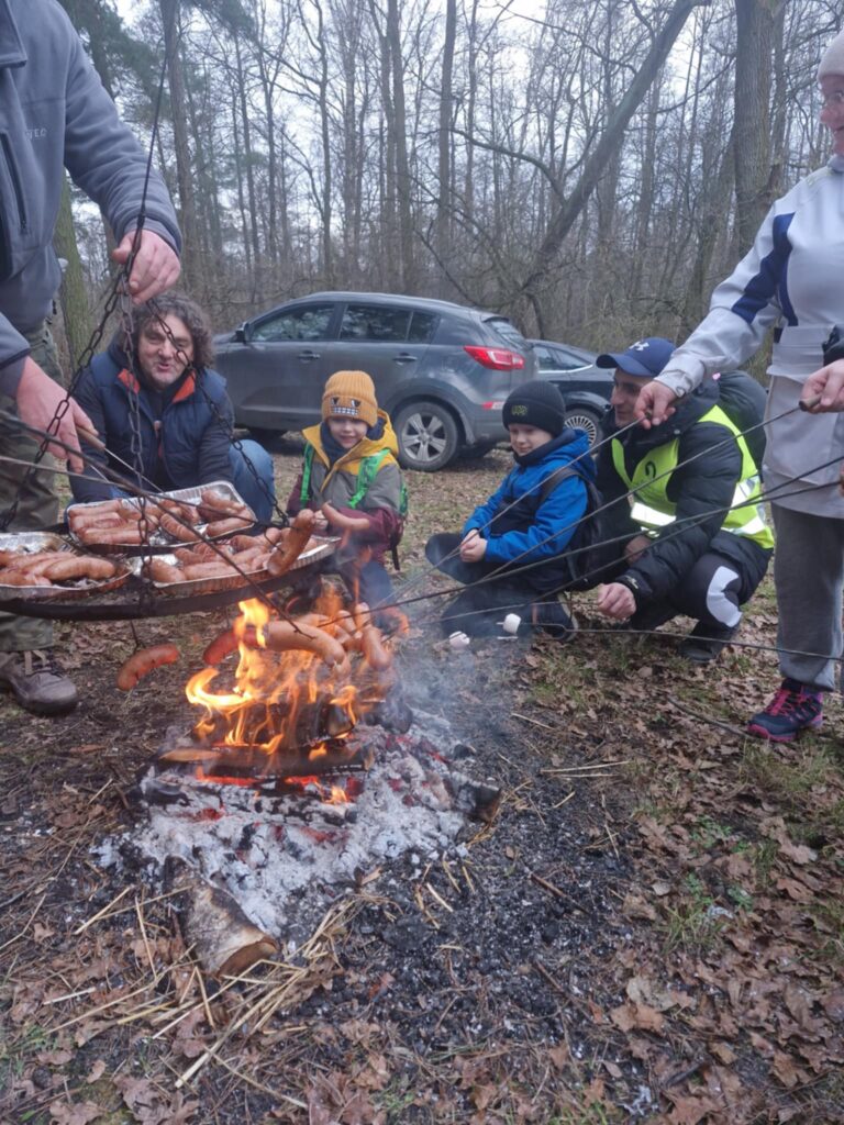 i trenerzy z OKsport Akademia Piłki Nożnej w Woli Krzysztoporskiej.  Po pokonaniu dystansu ok.8 km: Wola Krzysztoporska – Kisiele – Wygoda uczestnicy rajdu dotarli do mety – staw przy Domu Wędkarza w Wygodzie. Tu czekała na nich pyszna, upieczona nad ogniskiem kiełbaska, a zadbał o to Prezes Koła PZW Nr 35 w Woli Krzysztoporskiej, pan Jarosław Warzyński, któremu pomagał pan Mariusz Wieczorek z GOK w Woli Krzysztoporskiej. Dla lekko zmarzniętych piechurów panie z KGW