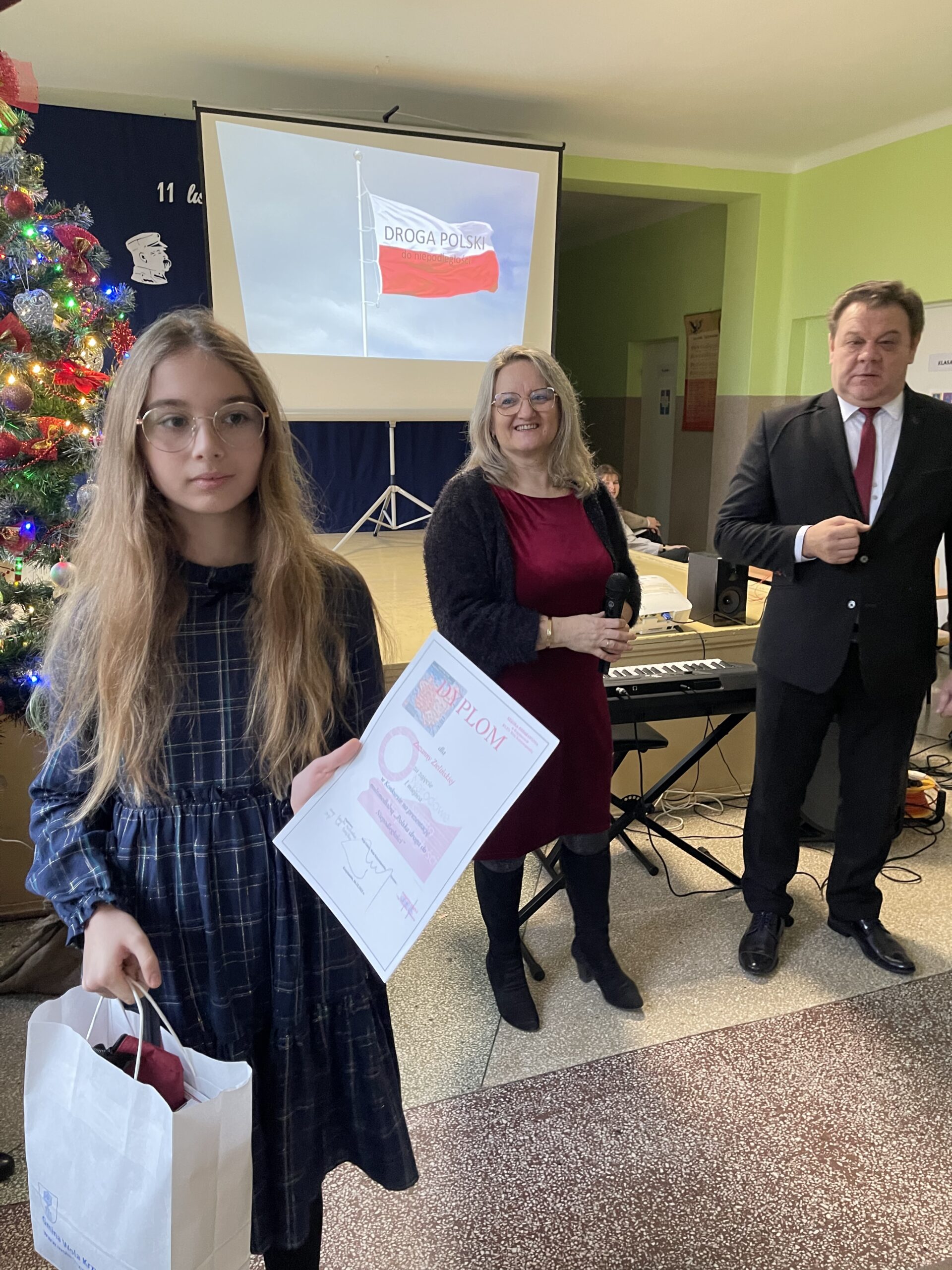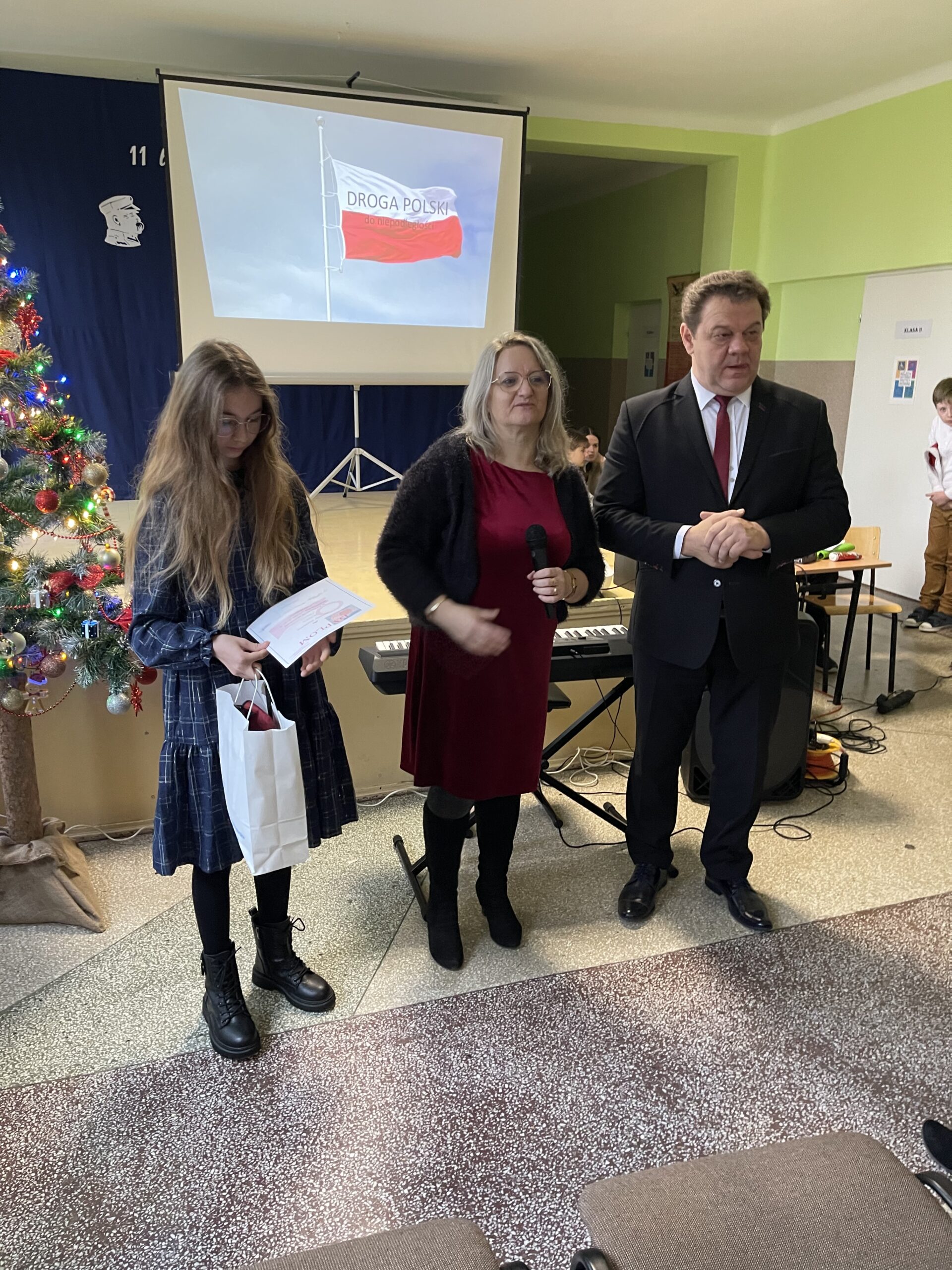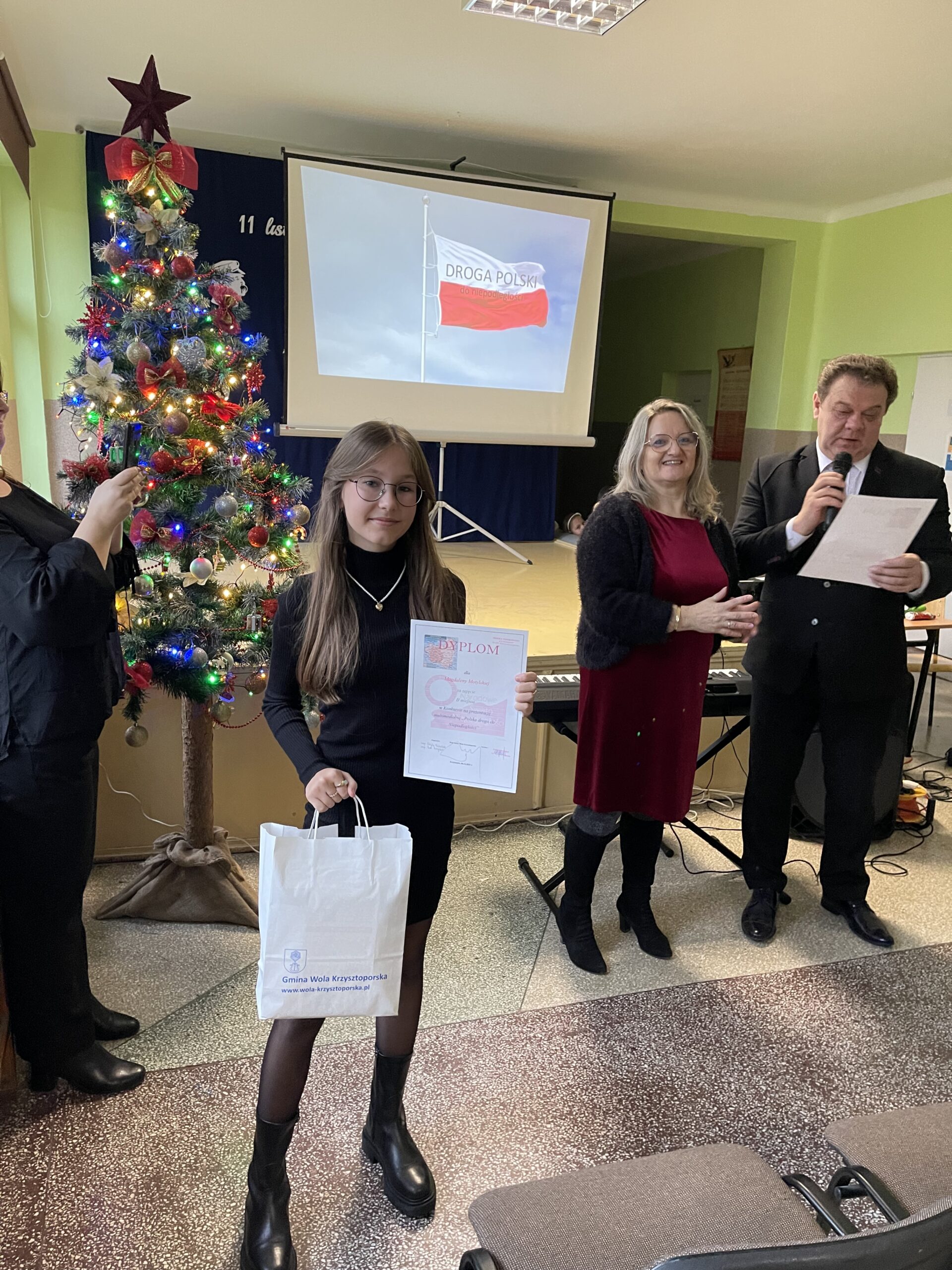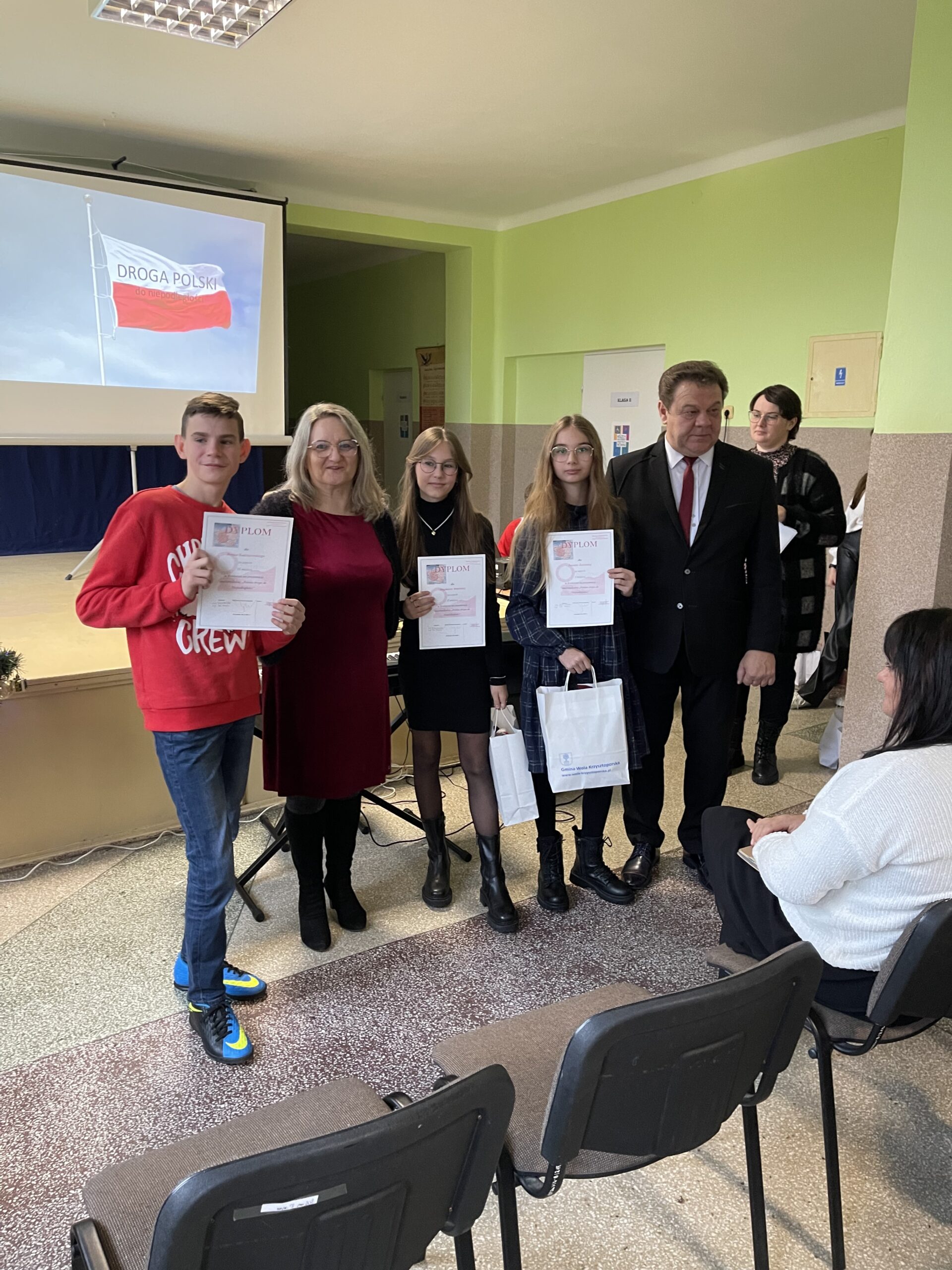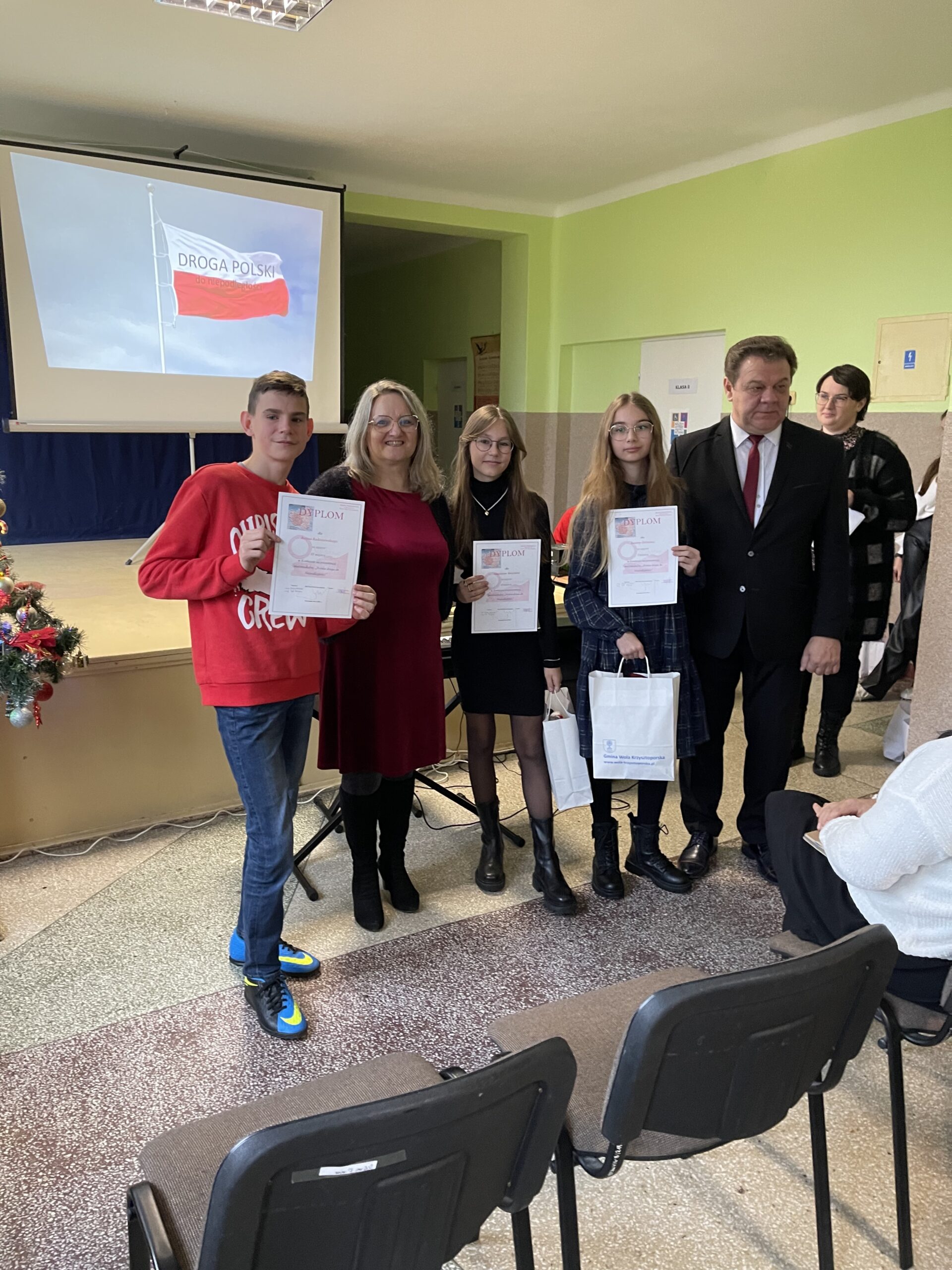 W dniu 6 grudznia 2022 r. w Szkole Podstawowej w Krzyżanowie odbyło się podsumowanie konkursu historycznego pod patronatem Wójta Gminy Wola Krzysztoporska – Romana Drozdka, ” Polskie drogi do niepodległości”. Konkurs miał na celu: przygotowanie młodzieży do aktywnego udziału w obchodach Święta Odzyskania Niepodległości, propagowanie oraz pogłębienie wiedzy na temat historii narodu polskiego oraz propagowanie postaw patriotycznych wśród młodzieży. Naszą szkołę w konkursie reprezentowało 12 uczniów, a zaszczytne miejsca otrzymały: Zuzanna Zielińska z klasy 6a – 1 miejsce oraz Magdalena Motylska z klasy 7b – 2 miejsce. Wszyscy uczestnicy konkursu otrzymali z rąk Pana Wójta oraz Pani Dyrektor Magdaleny Ryżewskiej dyplomy oraz upominki za wzięcie udziału w przedsięwzięciu. Gratulujemy naszym zdolnym zwyciężczyniom i życzymy dalszych sukcesów, a wszystkich uczestników zachęcamy do wzięcia udziału w kolejnej edycji konkursu.