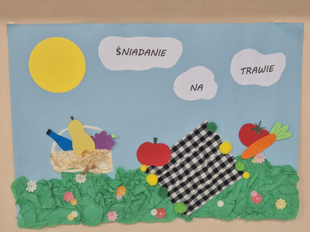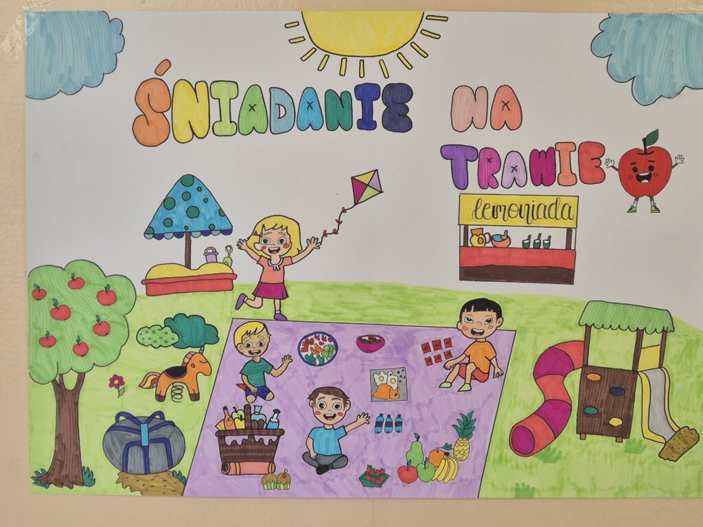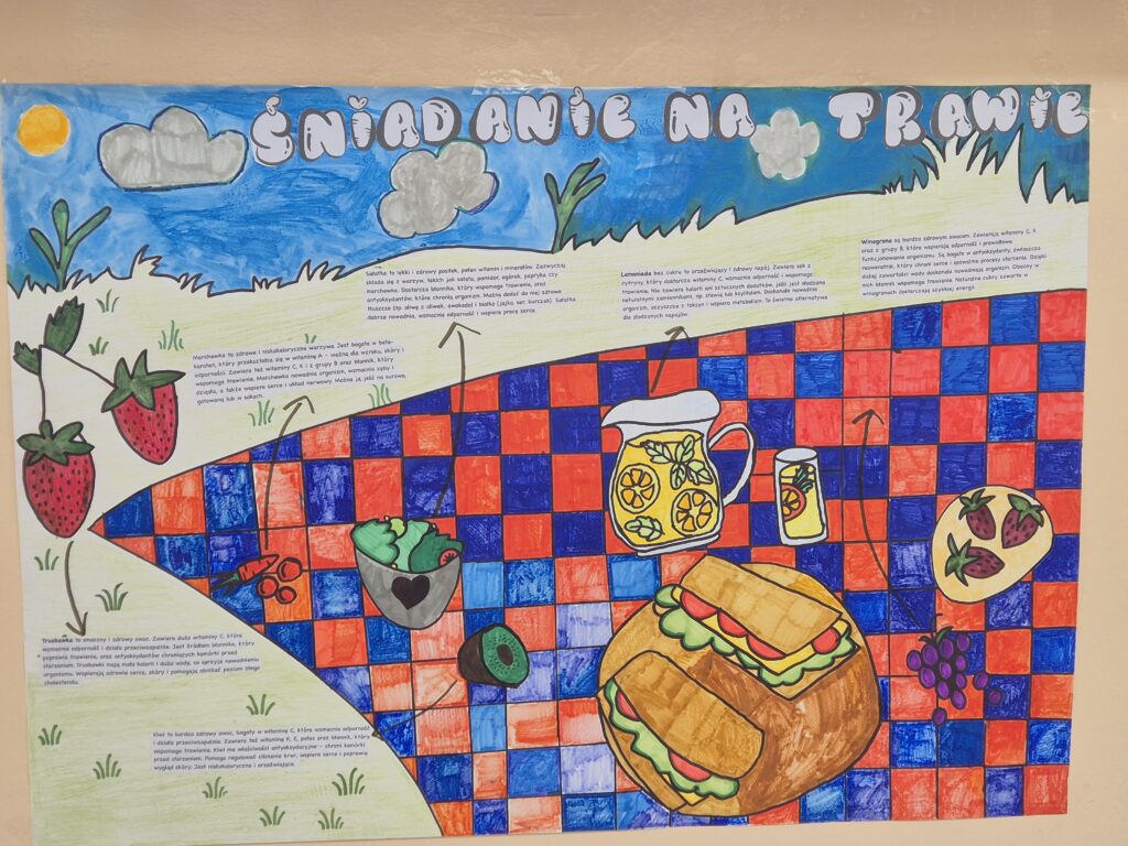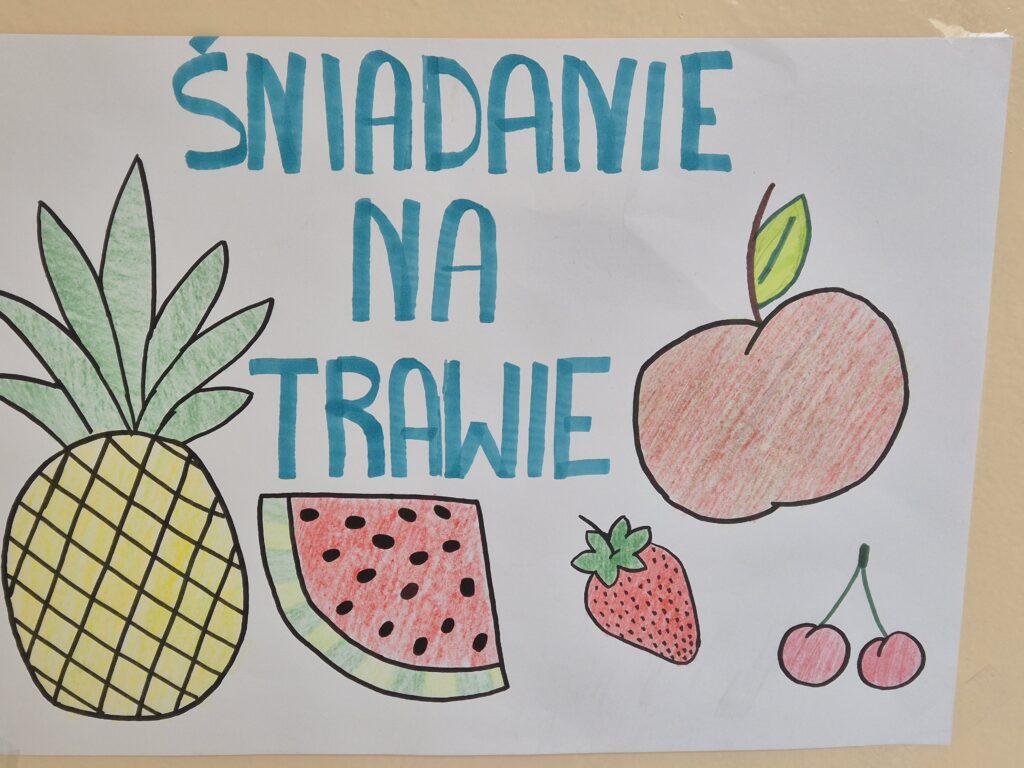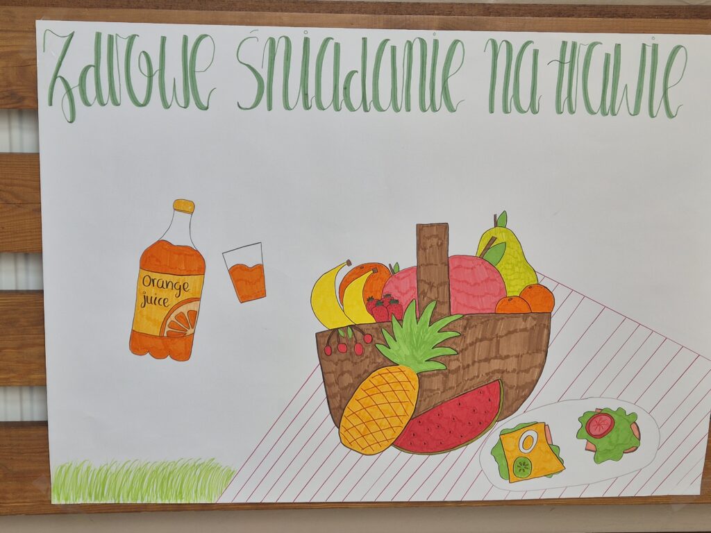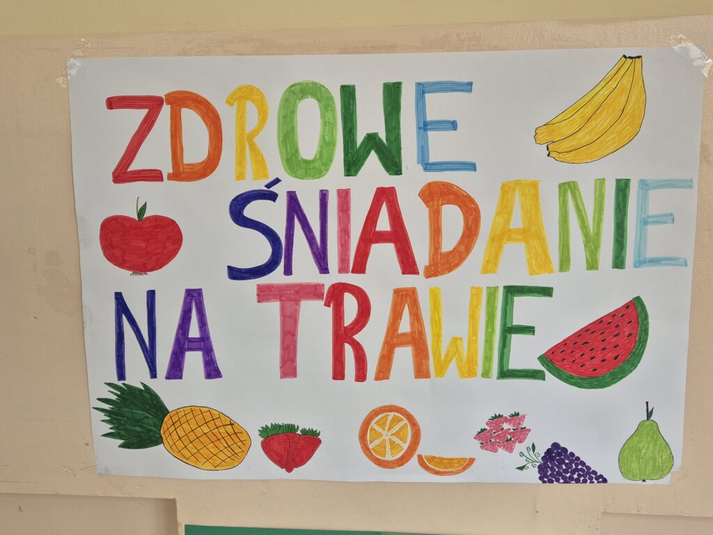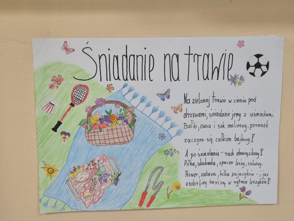 Wspólny posiłek pod hasłem ,,Śniadanie na trawie” w ramach Ogólnopolskiego programu Trzymaj Formę miał promować zdrowe nawyki żywieniowe wśród uczniów naszej szkoły. Uczniowie z klas IV – VIII w ramach zajęć technicznych przygotowali piękne plakaty, które promowały tę ,,zdrową” akcję.