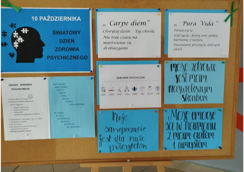 Z okazji obchodów ogólnoświatowego wydarzenia promującego zdrowie, dobrostan fizyczny jak i psychiczny szkoła przeprowadziła szereg oddziaływań przypominających jak ważne jest zdrowie psychiczne, jak o nie dbać i zachować zdrowy balans w życiu.