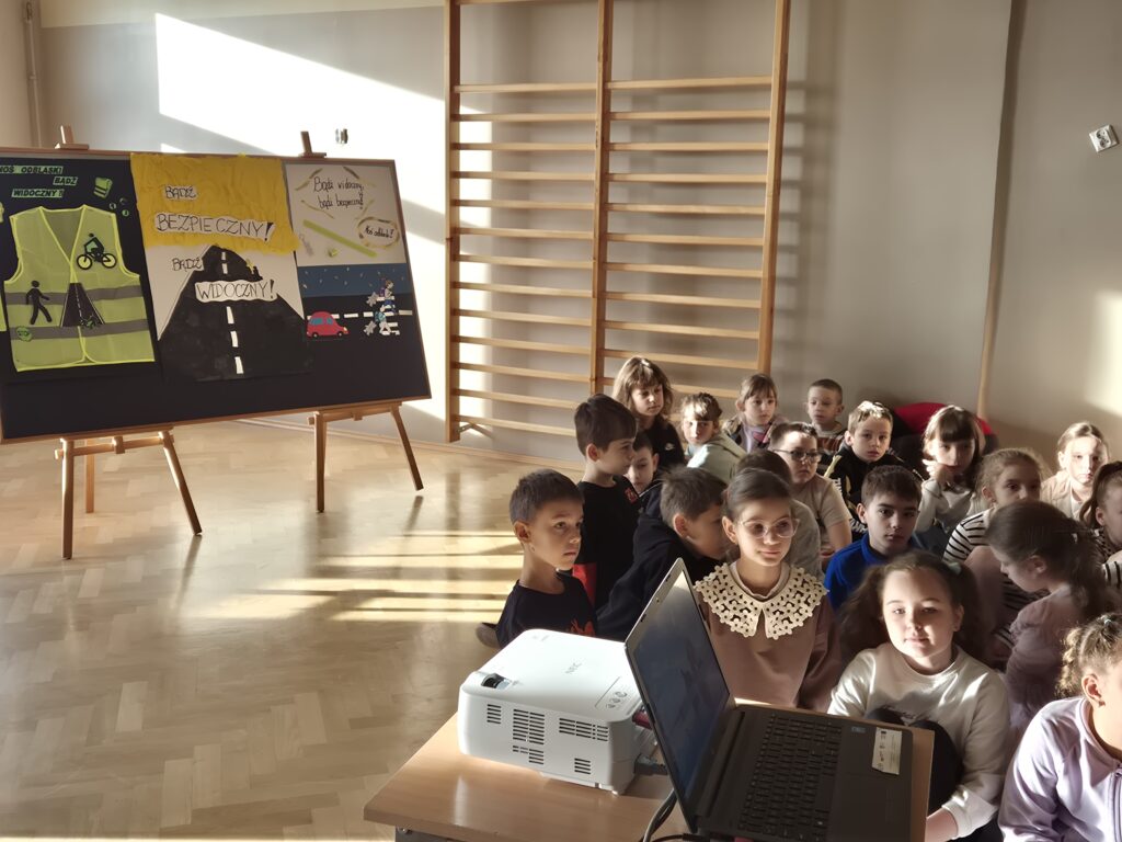 Spotkanie odbyło się w dwóch grupach, uczniowie klas II i III zgłębiali wiedzę dotyczącą bezpieczeństwa pieszych i rowerzystów na drodze. Podczas zajęć szczególną uwagę zwrócono na znaczenie elementów odblaskowych w okresie jesieni i zimy.