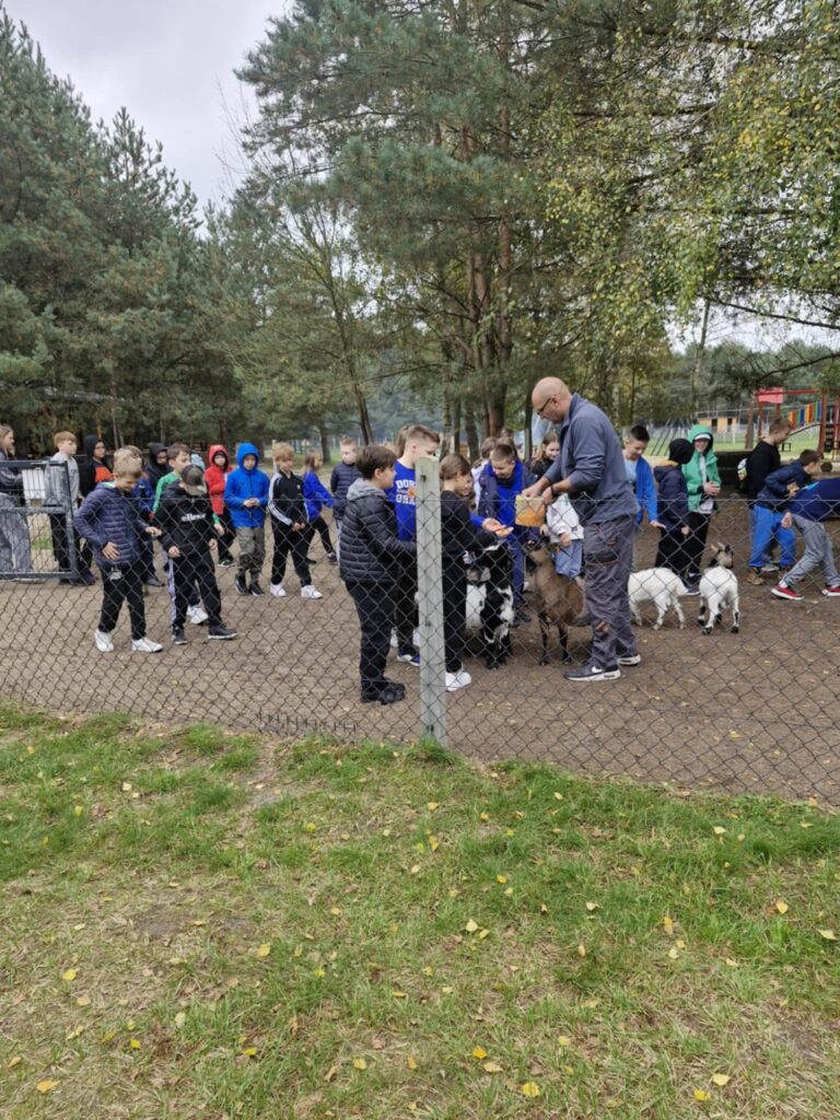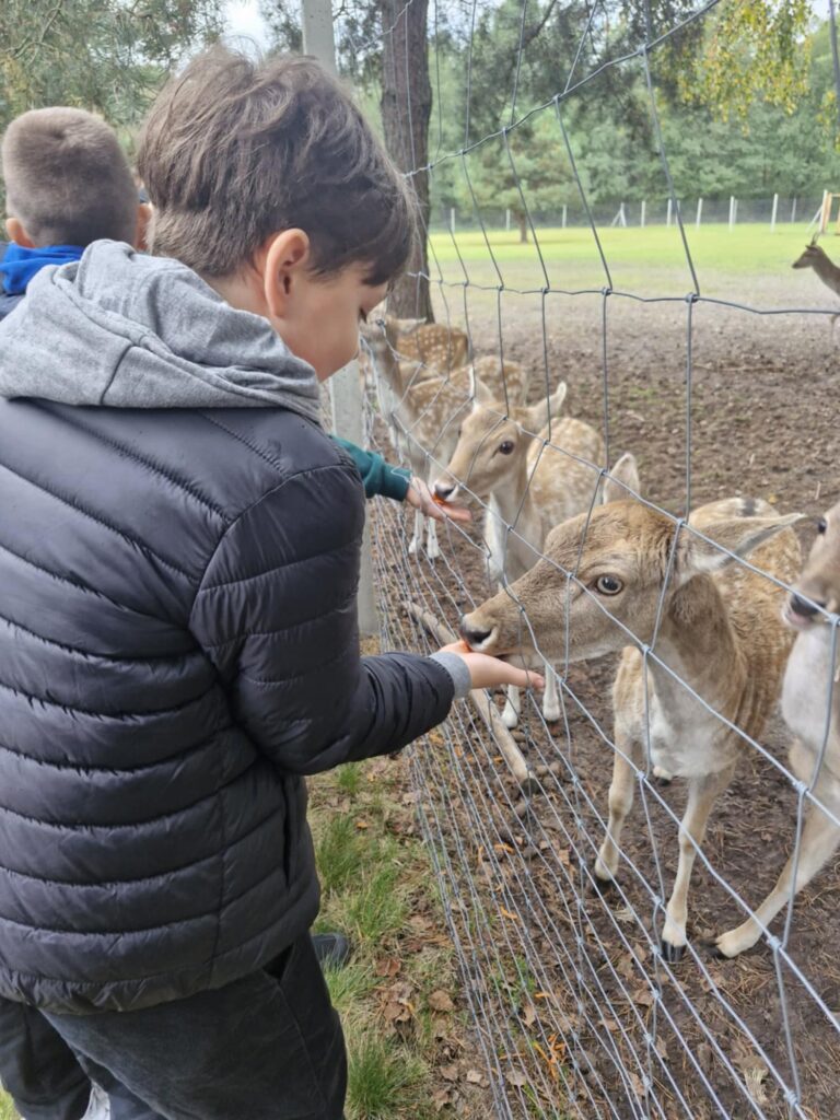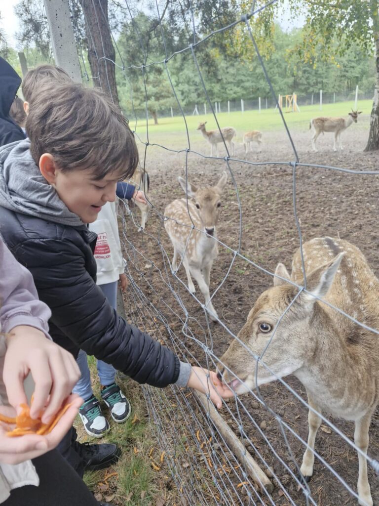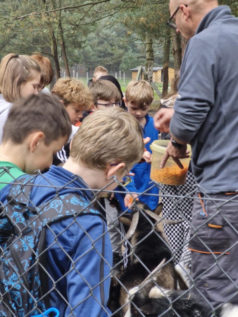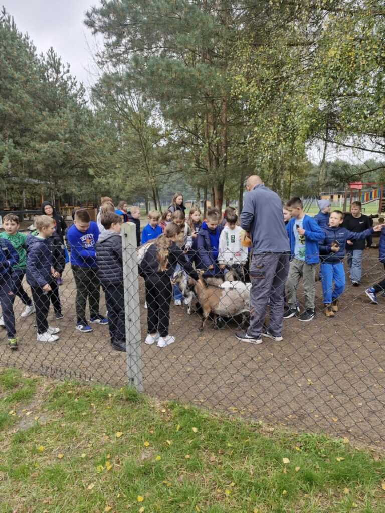 z nich mogli karmić i dotykać, co zrobiło ogromne wrażenie. Po spacerze uczestnicy udali się na ogromny plac zabaw, gdzie mogli zjeżdżać na tyrolce, grać w piłkę czy nadal karmić zwierzęta. Kolejną atrakcją było ognisko i pieczone kiełbaski, które zostały skonsumowane