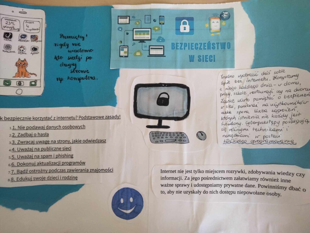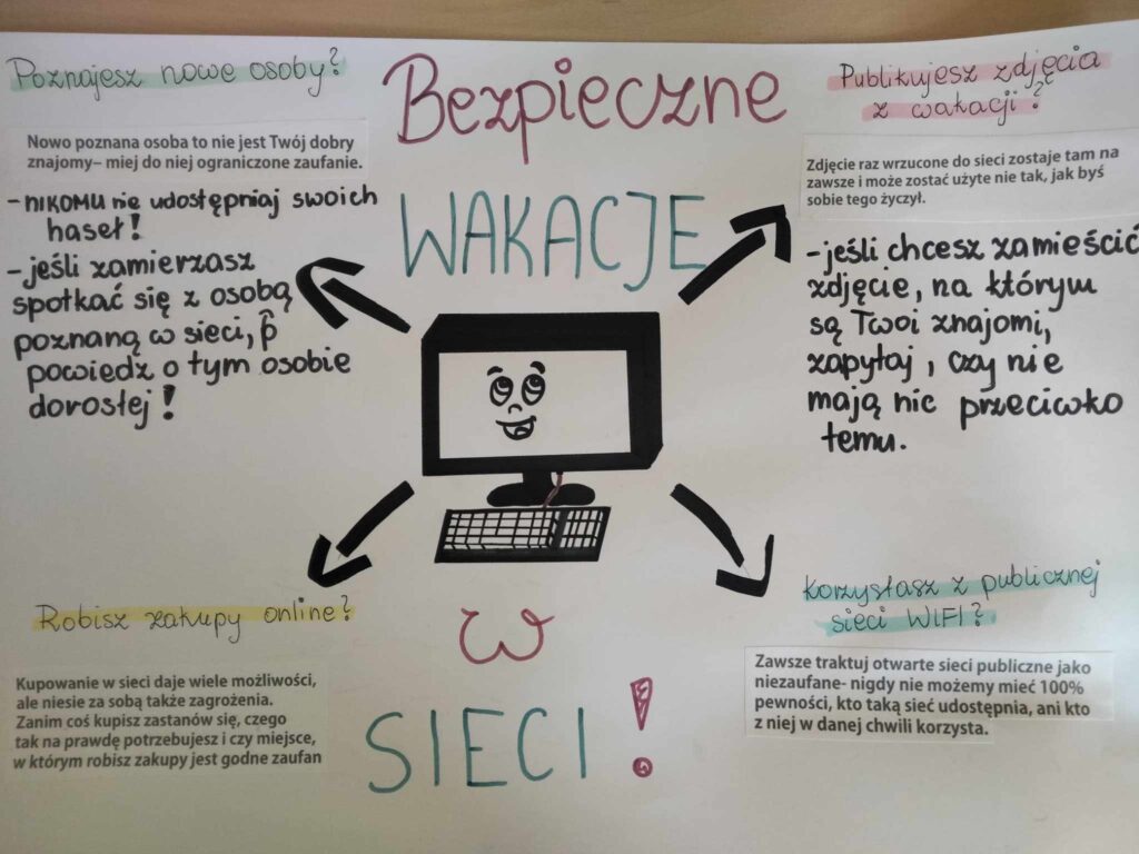 W ramach lekcji informatyki chętni uczniowie przygotowali dla swoich kolegów i koleżanek plakaty oraz prezentacje przypominające o bezpiecznych wakacjach w sieci. ![]()