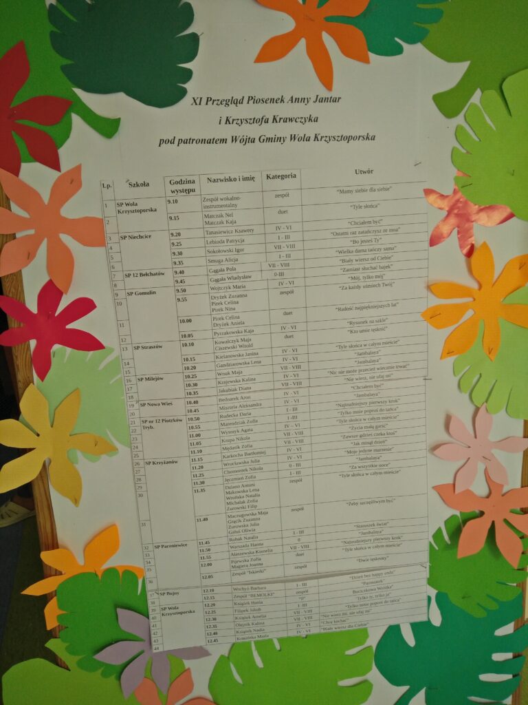 Dnia 13.04.2023r. w Szkole Podstawowej im. generała Ludwika Czyżewskiego w Woli Krzysztoporskiej odbył się XI Przegląd Piosenek Anny Jantar i Krzysztofa Krawczyka pod patronatem Wójta Gminy Wola Krzysztoporska.