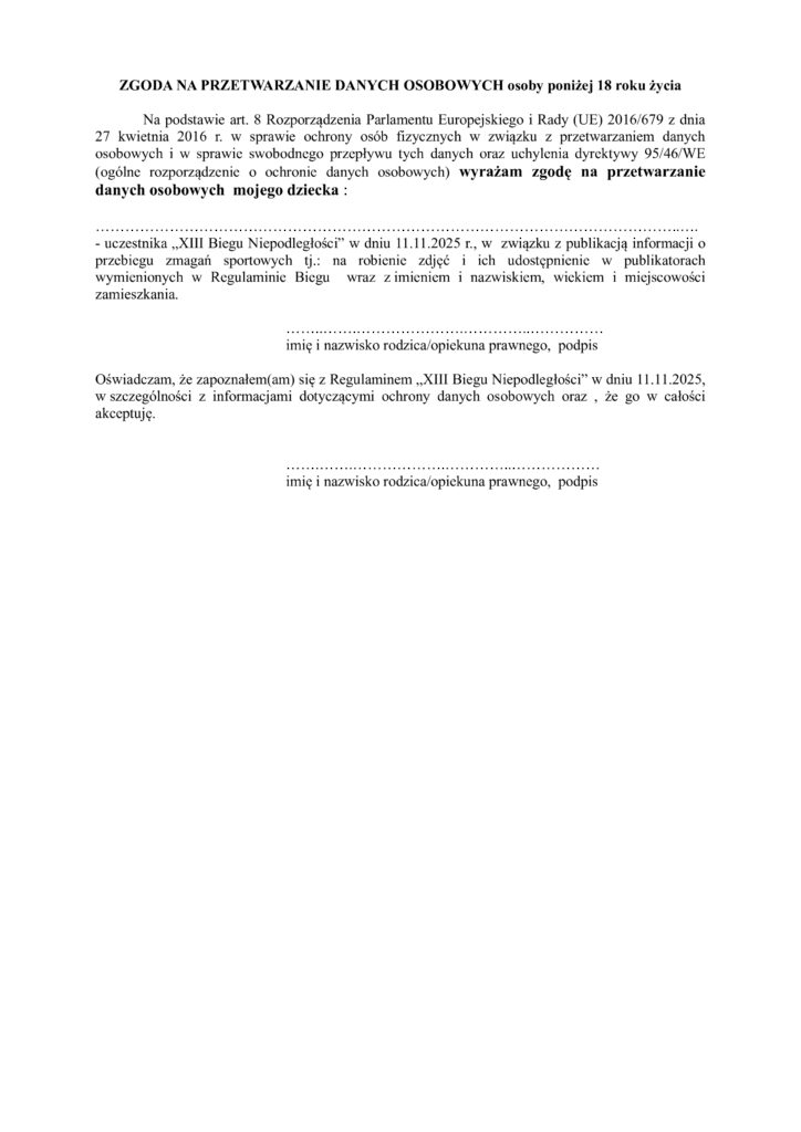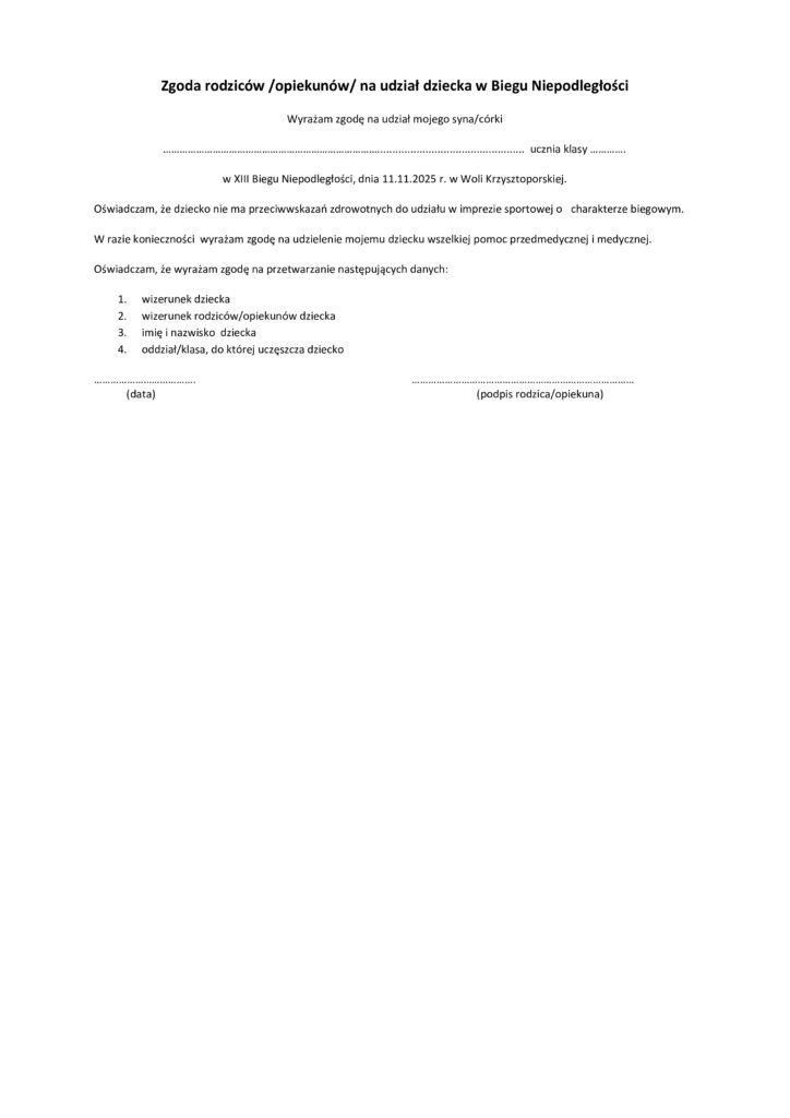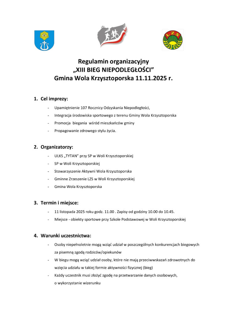 „XIII BIEG NIEPODLEGŁOŚCI” przez admin · 30 października 2025 REGULAMIN XIII BIEGU NIEPODLEGŁOŚCI ! ZAPRASZAMY DO UDZIAŁU!REGULAMIN DO POBRANIAPobierz