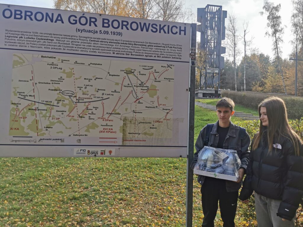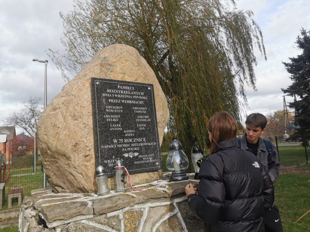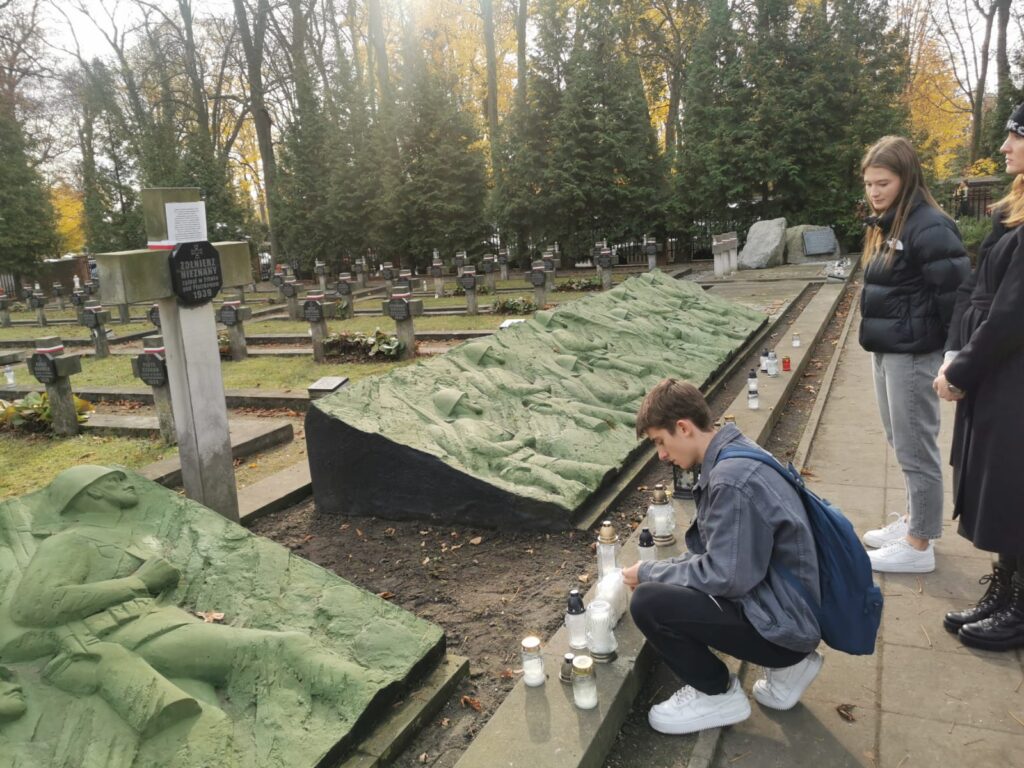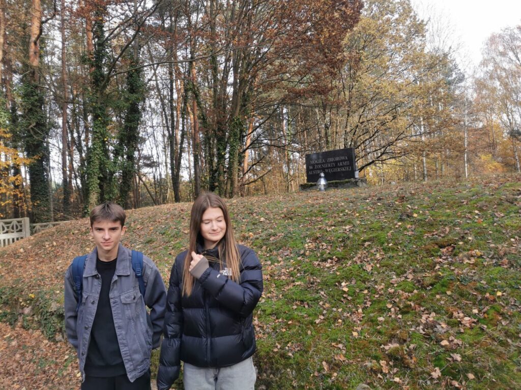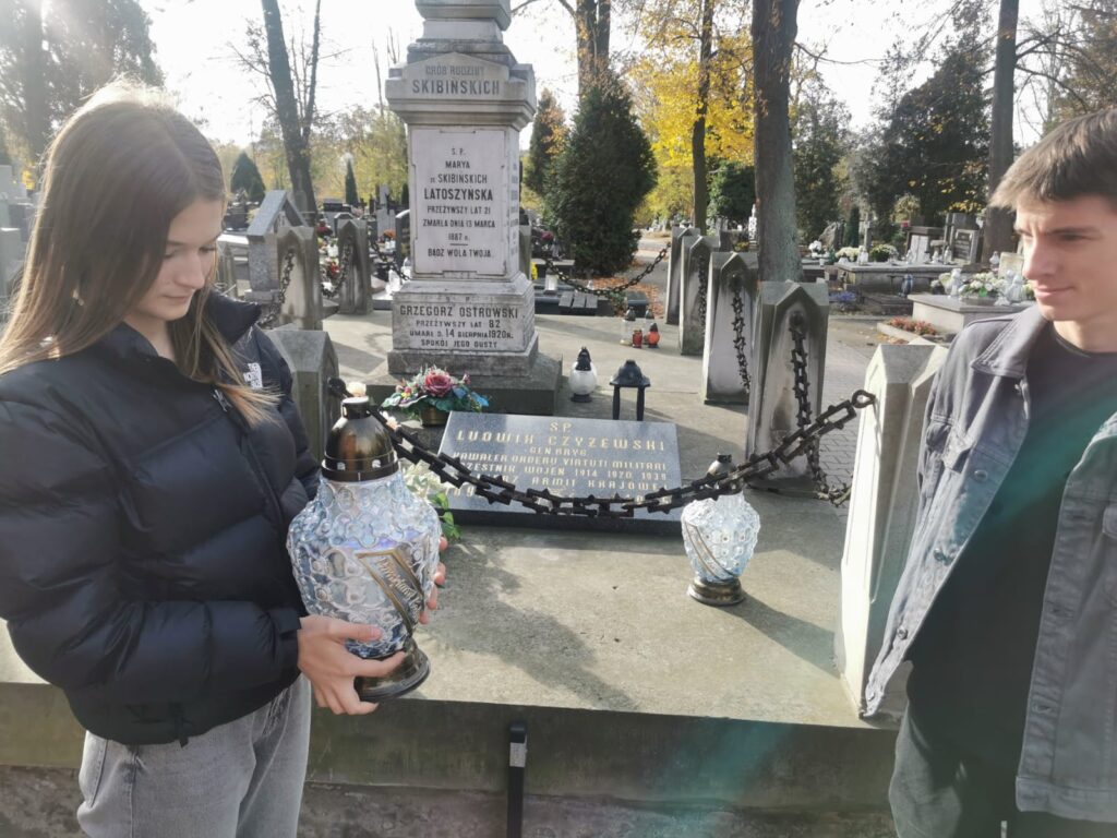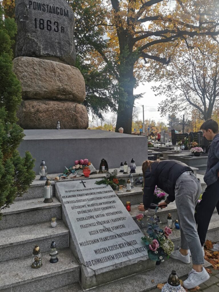 Dnia 31 października uczniowie klas 8A – Hanna Tręda i Wiktor Cejnóg wraz z opiekunami uczcili pamięć poległych za Ojczyznę żołnierzy. Okres przed Dniem Wszystkich Świętych to odpowiedni moment na wspomnienie o tych, którzy odeszli od nas, czas na rozmowy dotyczące szacunku dla zmarłych bohaterów. Młodzież odwiedziła ich groby, posprzątała i uporządkowała je. Zapaliła symboliczne światło pod pomnikiem Obrońców Gór Borowskich. Następnie uczniowie udali się na stary cmentarz w Piotrowie Trybunalskim, gdzie spoczywa generał Ludwik Czyżewski – patron naszej szkoły. Przedstawiciele klasy złożyli kwiaty, zapalili znicze, w cichej modlitwie uczcili pamięć bohatera. W drodze powrotnej zatrzymali się przy obelisku w Woli Krzysztoporskiej, aby uczcić pamięć mieszkańców naszej miejscowości, rozstrzelanych przez niemieckich najeźdźców w 1939 roku. Ten dzień był piękną lekcją historii, momentem zadumy nad losem polskich bohaterów. Pielęgnowanie pamięci o tych, którzy oddali życie za naszą Ojczyznę jest wyrazem naszego szacunku i uznania dla ich czynów, bo „Umarłych wieczność dotąd trwa, dokąd pamięcią się im płaci”.
